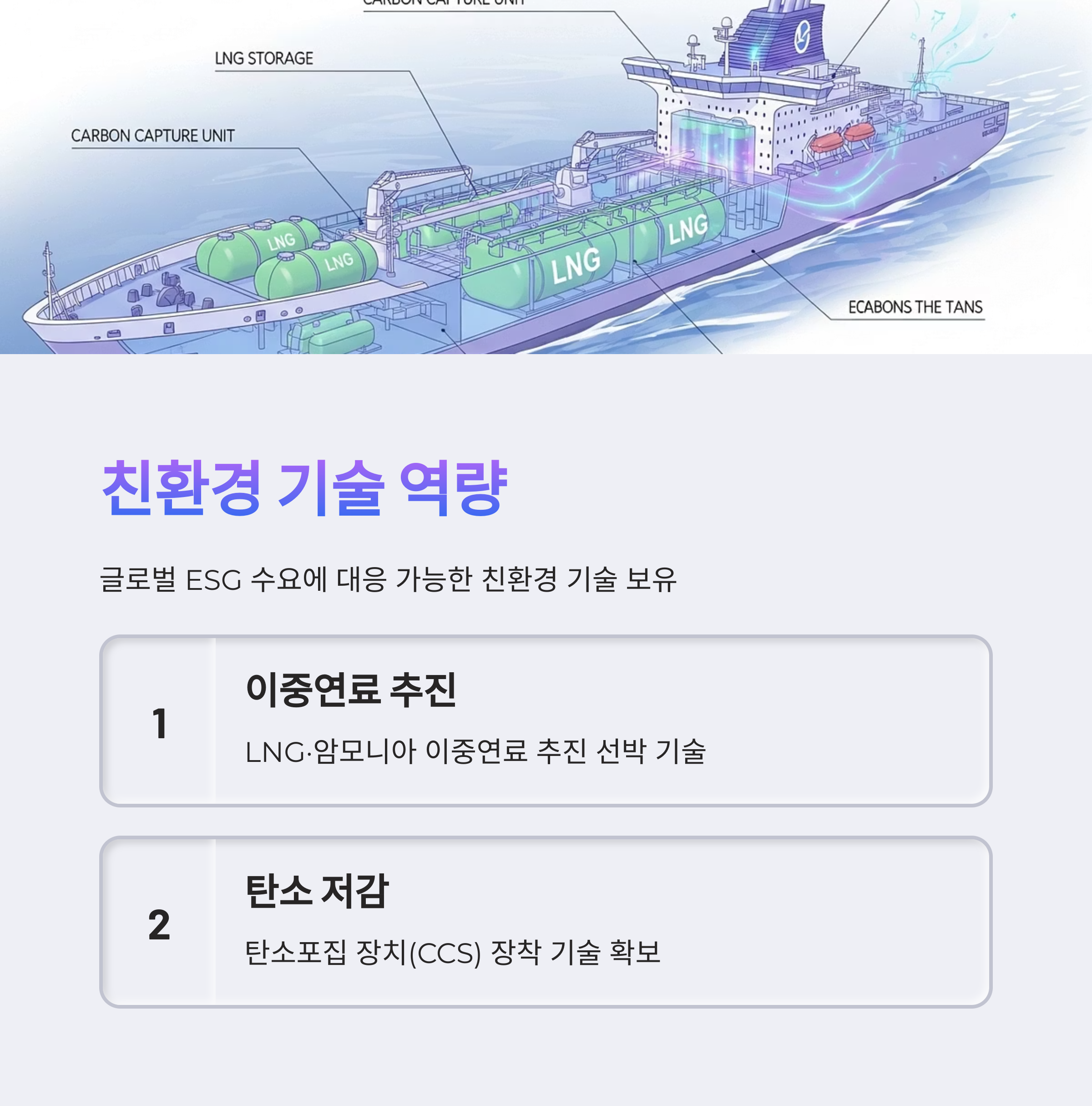 친환경 선박에 대한 대응력도 높습니다. LNG·암모니아 이중연료 추진 선박과 탄소포집 장치(CCS) 장착 기술까지 갖추고 있으며, ESG 기반 글로벌 수요에 대응 가능한 체제를 구축했습니다.