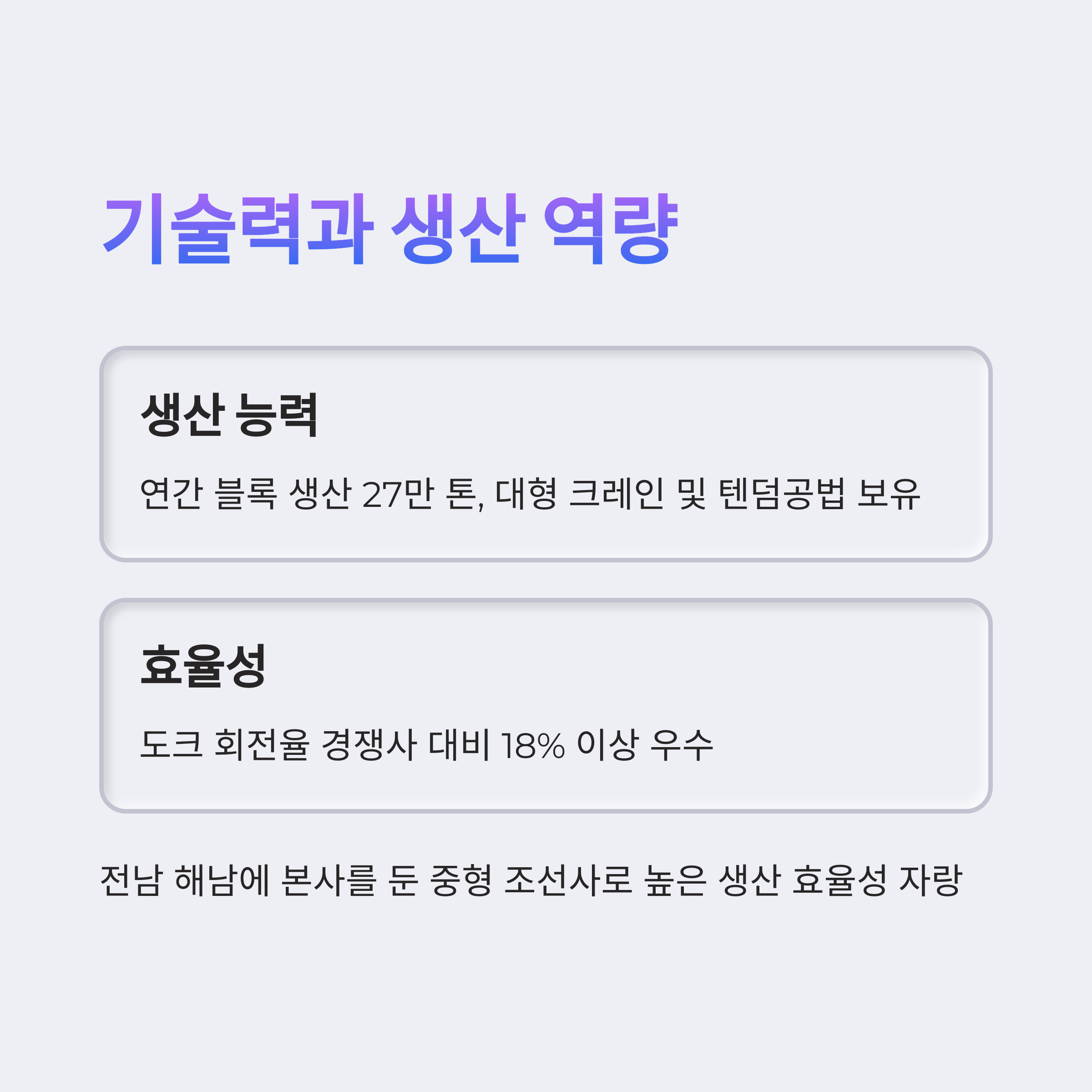 현재는 연간 블록 생산 27만 톤, 대형 크레인 및 텐덤공법을 보유한 조선사로 성장했으며, 도크 회전율이 경쟁사 대비 18% 이상 우수합니다.