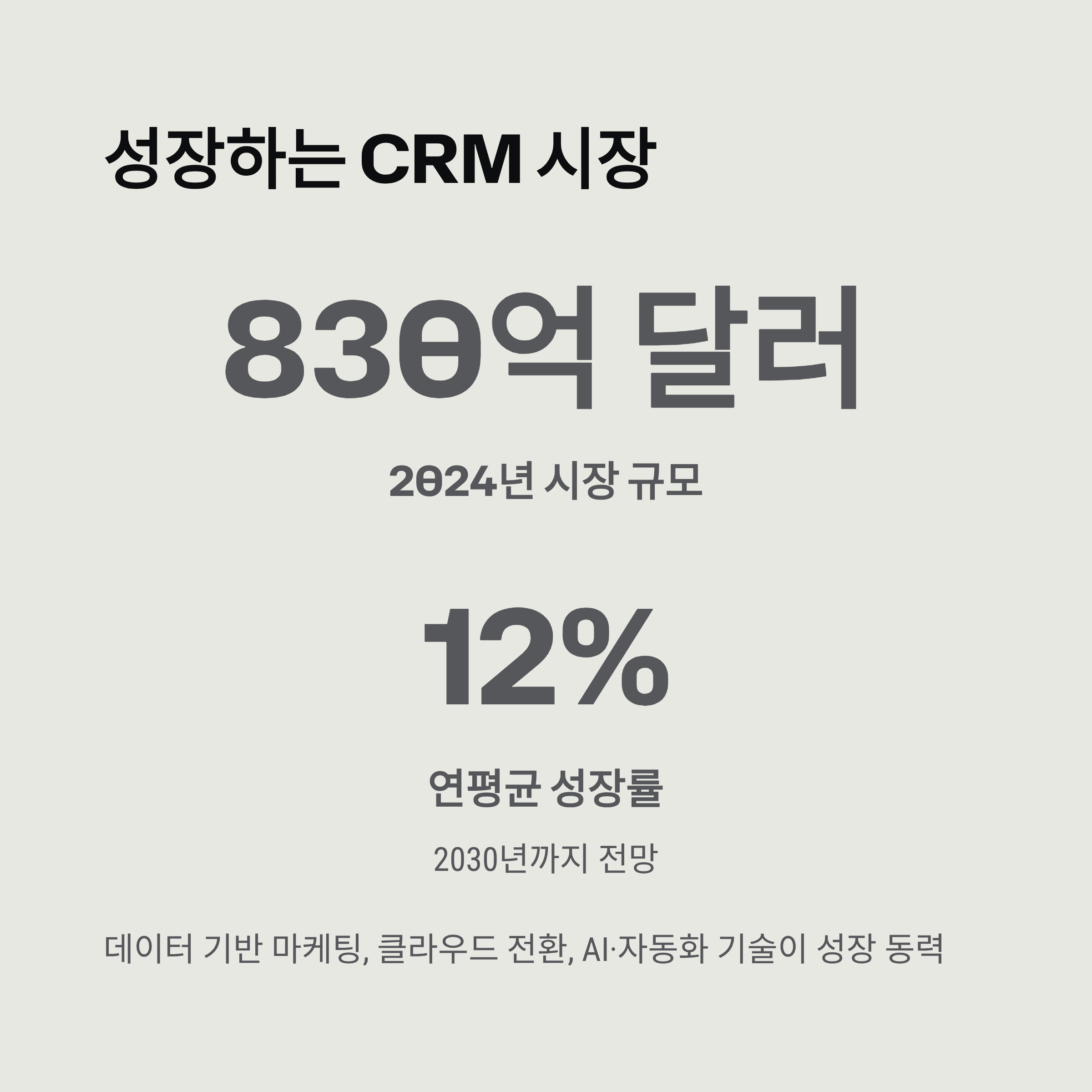글로벌 CRM 시장은 2024년 약 830억 달러 규모로 성장했으며, 2030년까지 연평균 12% 성장할 전망입니다. 데이터 기반 마케팅, 클라우드 전환, AI·자동화 기술 확산이 주요 동력입니다.