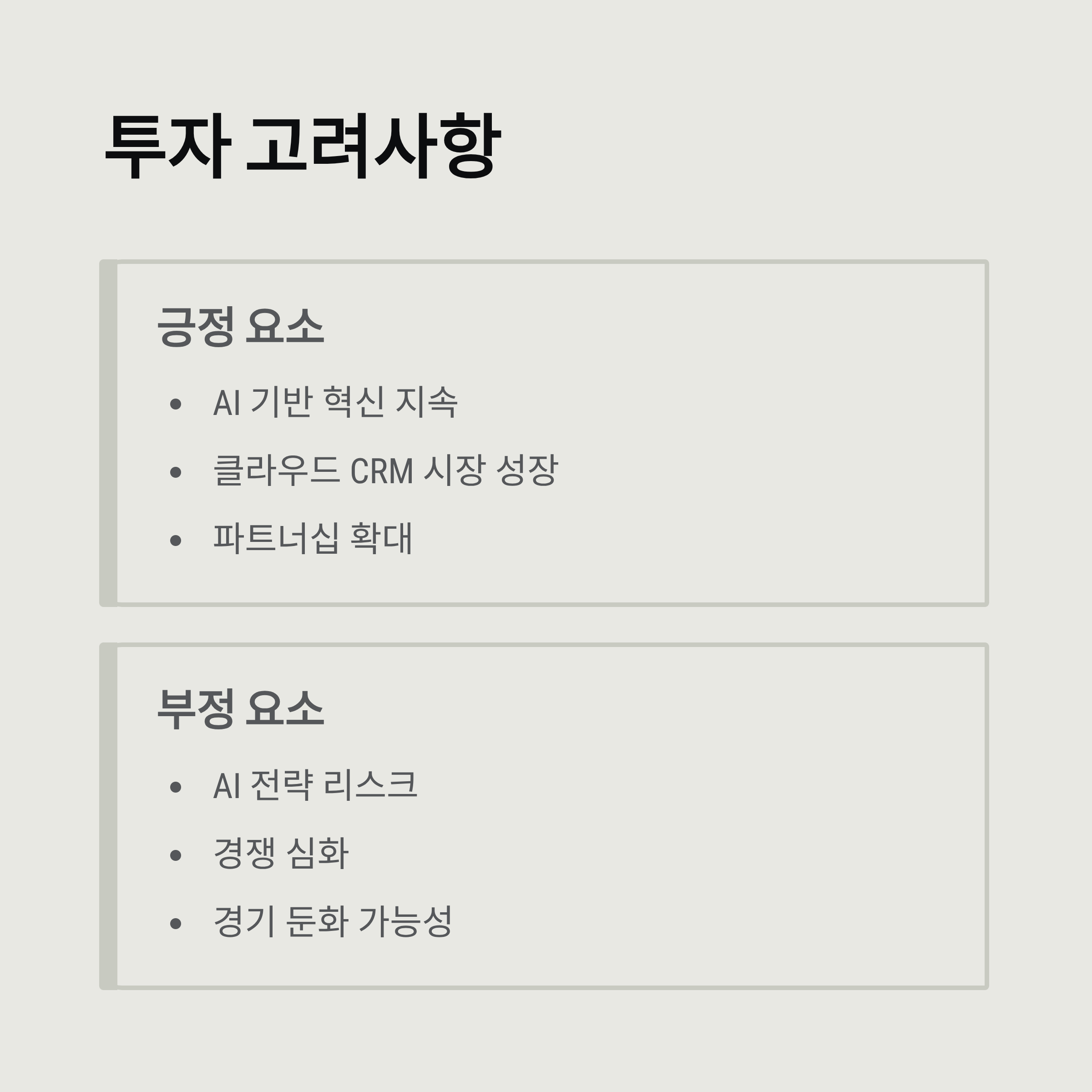 긍정 요소: AI 기반 혁신, 파트너십 확대, 클라우드 CRM 시장 성장 부정 요소: AI 전략 리스크, 경쟁 심화, 경기 둔화 가능성