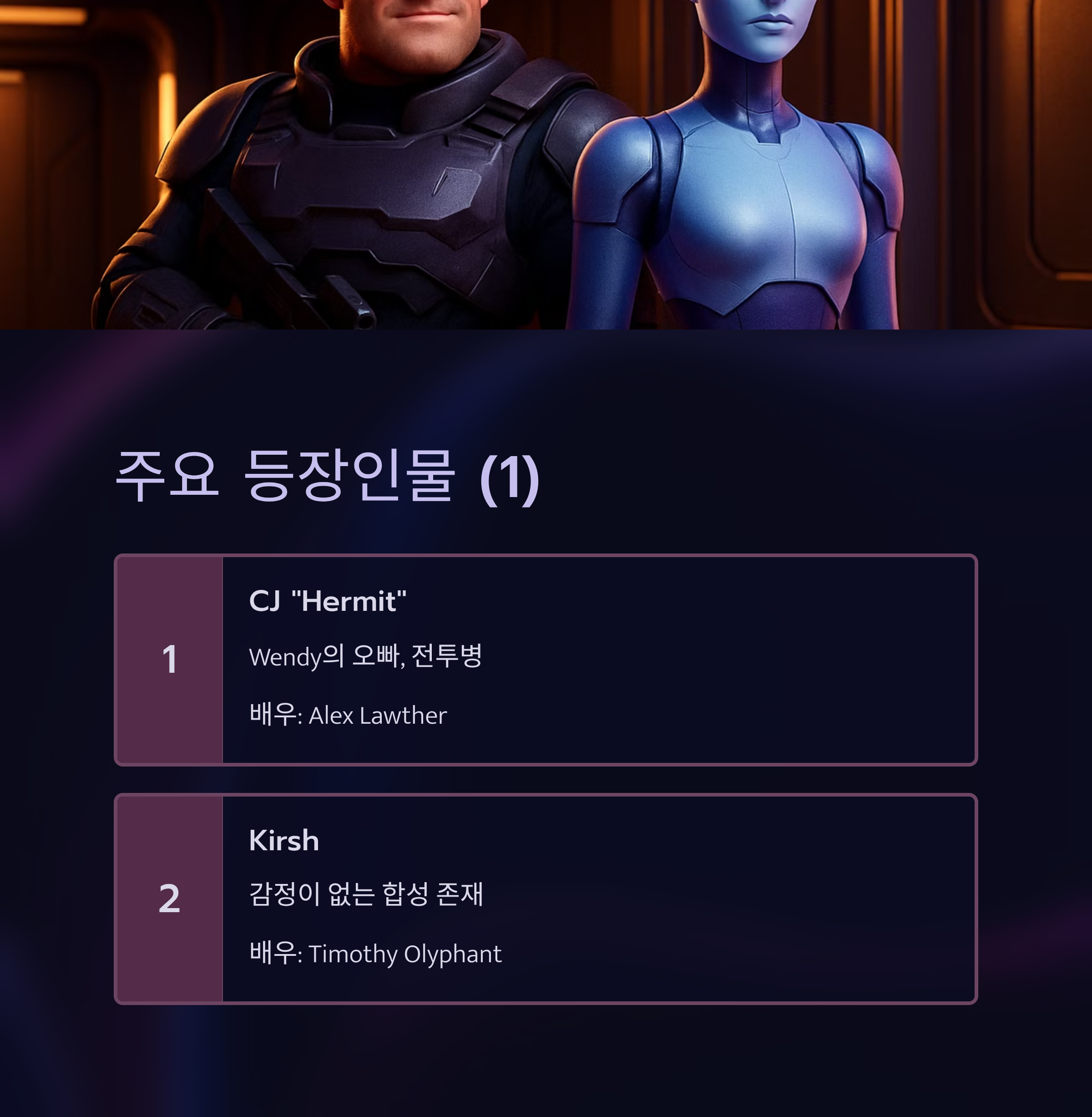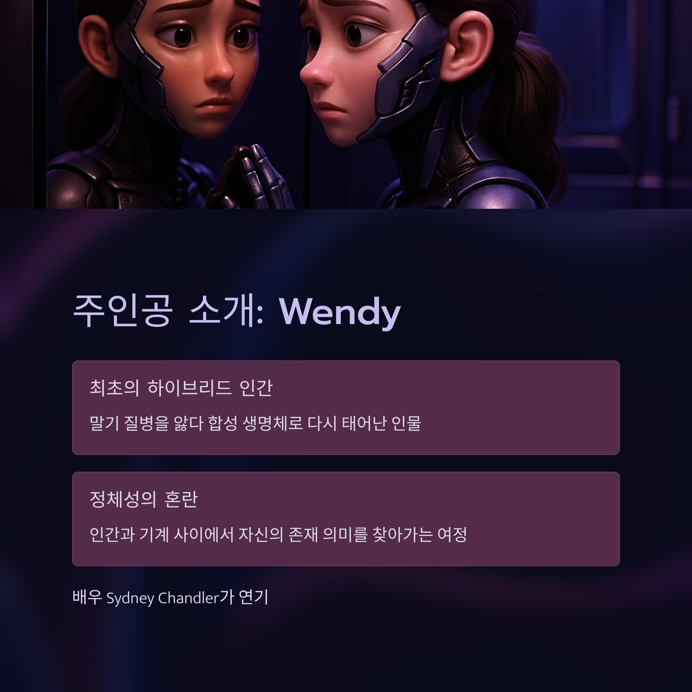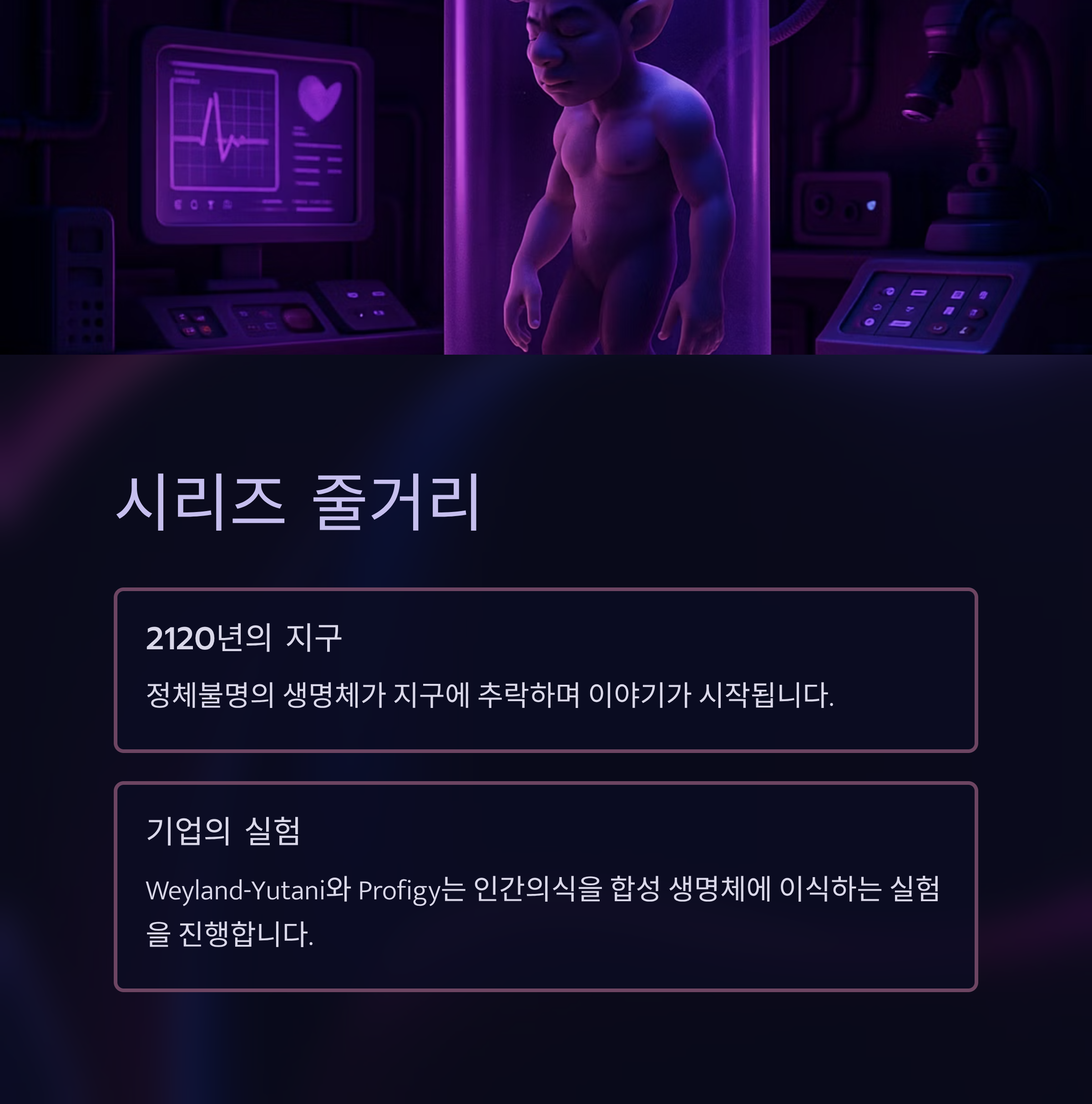 2120년, 지구에 정체불명의 생명체가 추락합니다. 이를 기점으로 거대 기술 기업인 Weyland‑Yutani와 Profigy는 인간의식을 합성 생명체에 이식하는 실험을 진행하게 되죠. 주인공 Wendy는 말기 질병을 앓다 최초의 하이브리드 인간으로 다시 태어난 인물로, 존재 정체성과 윤리 문제를 상징적으로 보여주는 캐릭터입니다.