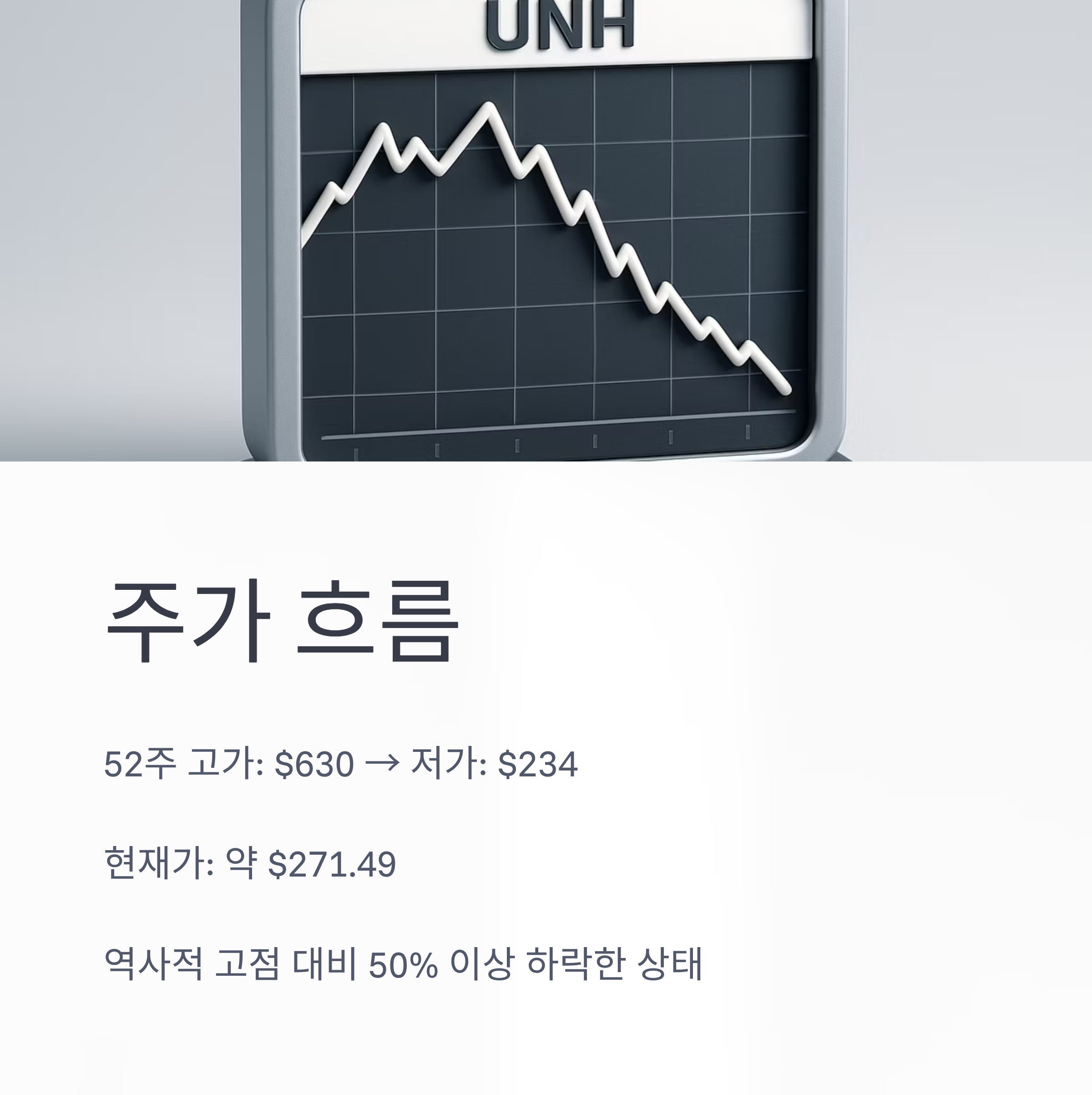 다만, 법무부의 Medicare 조사, 사이버 공격, 전 CEO 피살 사건 등 복합 리스크도 존재합니다. 주가는 52주 고점 $630에서 저점 $234까지 하락 후 현재 약 $271 수준입니다.