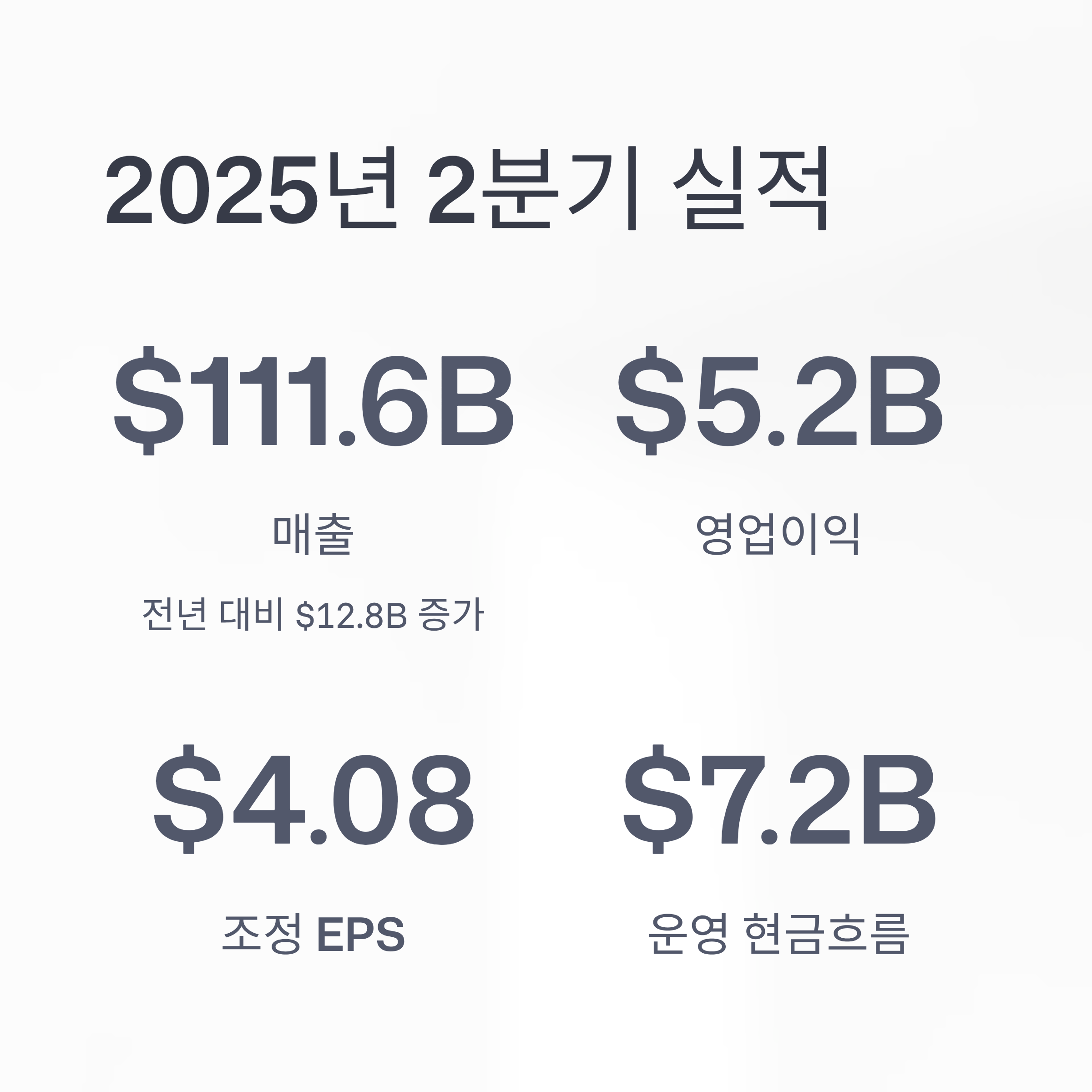 | 2025년 2분기 매출 | $111.6B (+$12.8B YoY) |