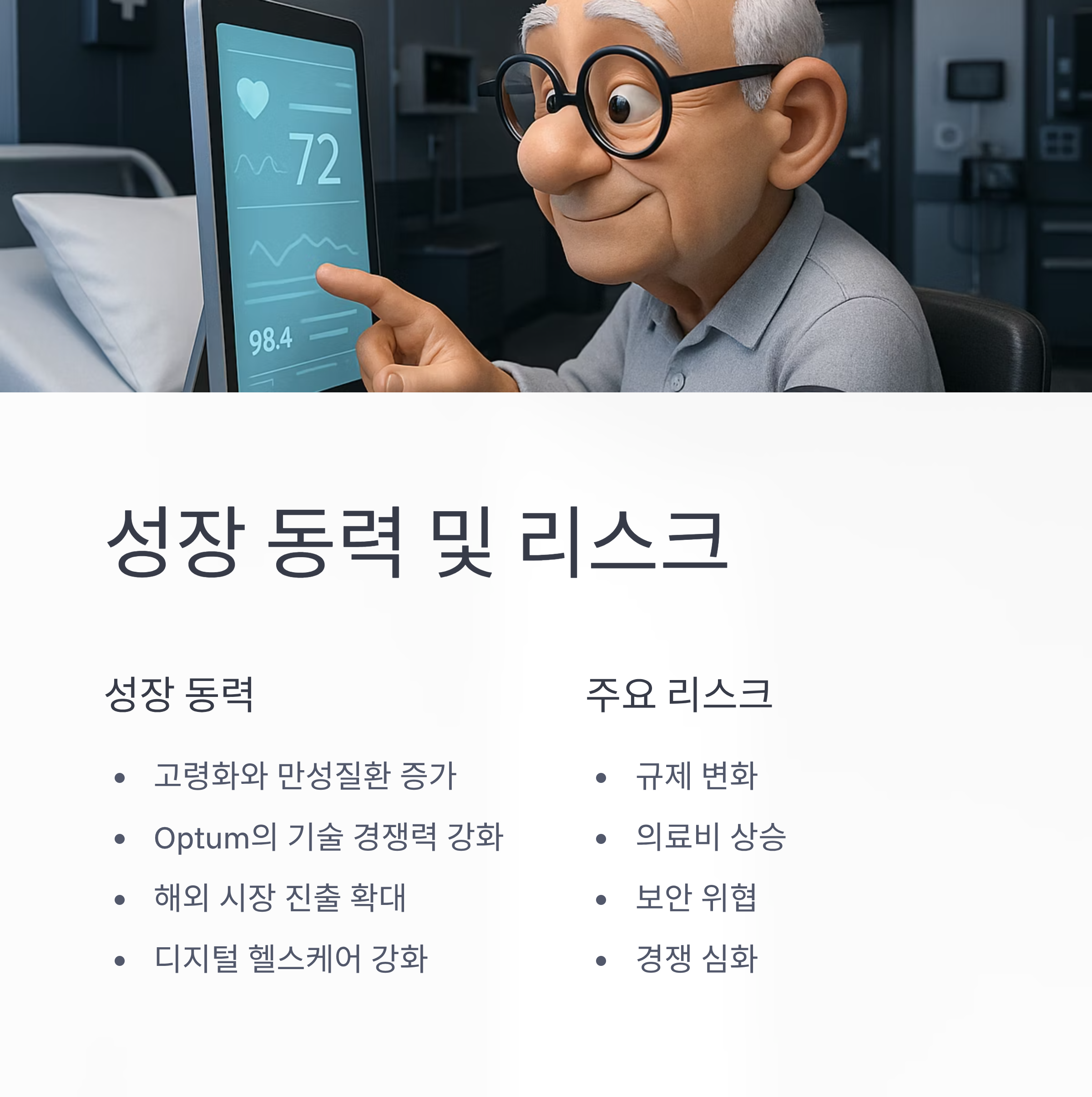 - 성장 요인: 고령화·만성질환 증가, Optum 기술 경쟁력, 해외 시장 확장, 디지털 헬스케어 강화