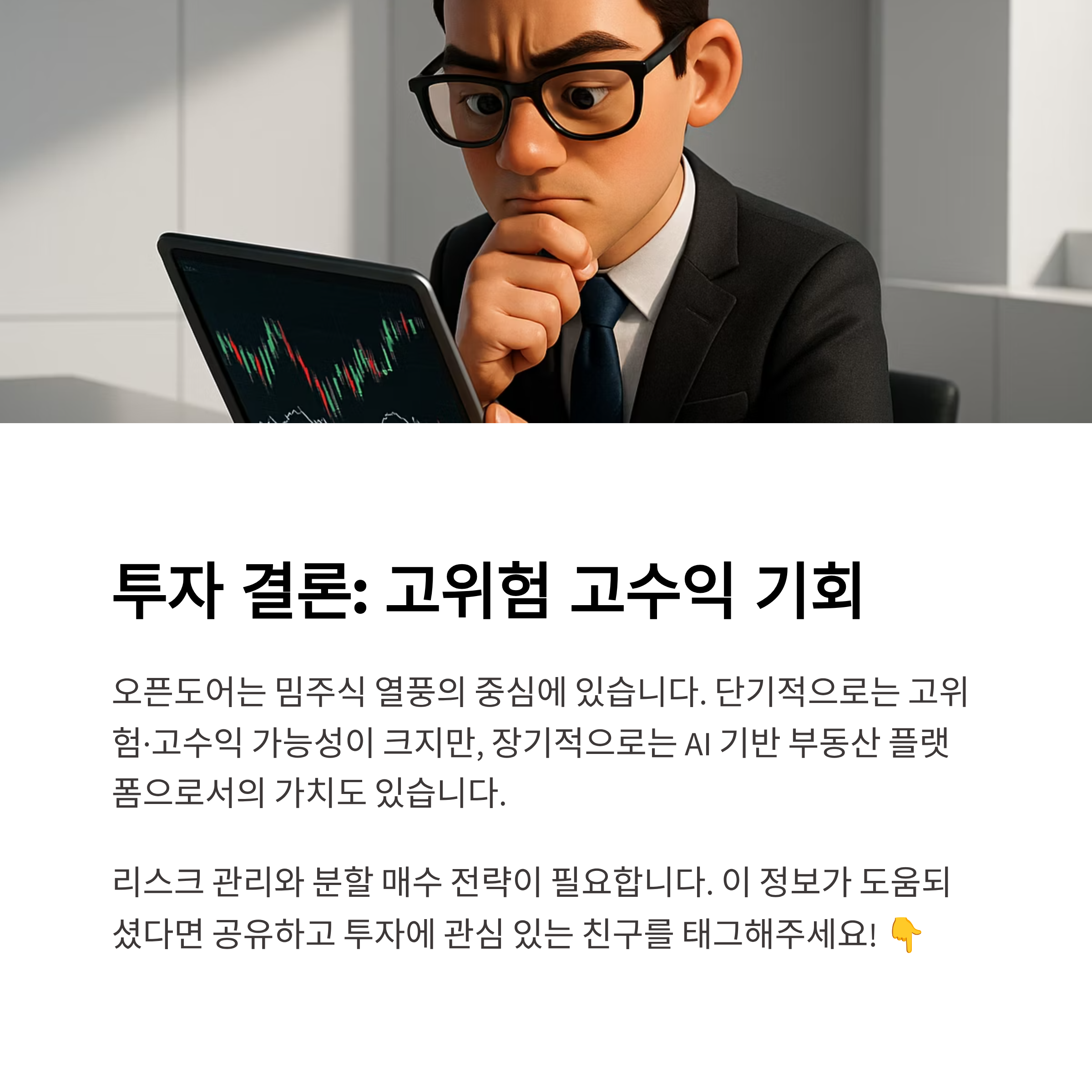 단기적으로는 고위험·고수익 가능성이 크지만, 장기적으로는 AI 기반 부동산 플랫폼이라는 점에서 기회도 있습니다.