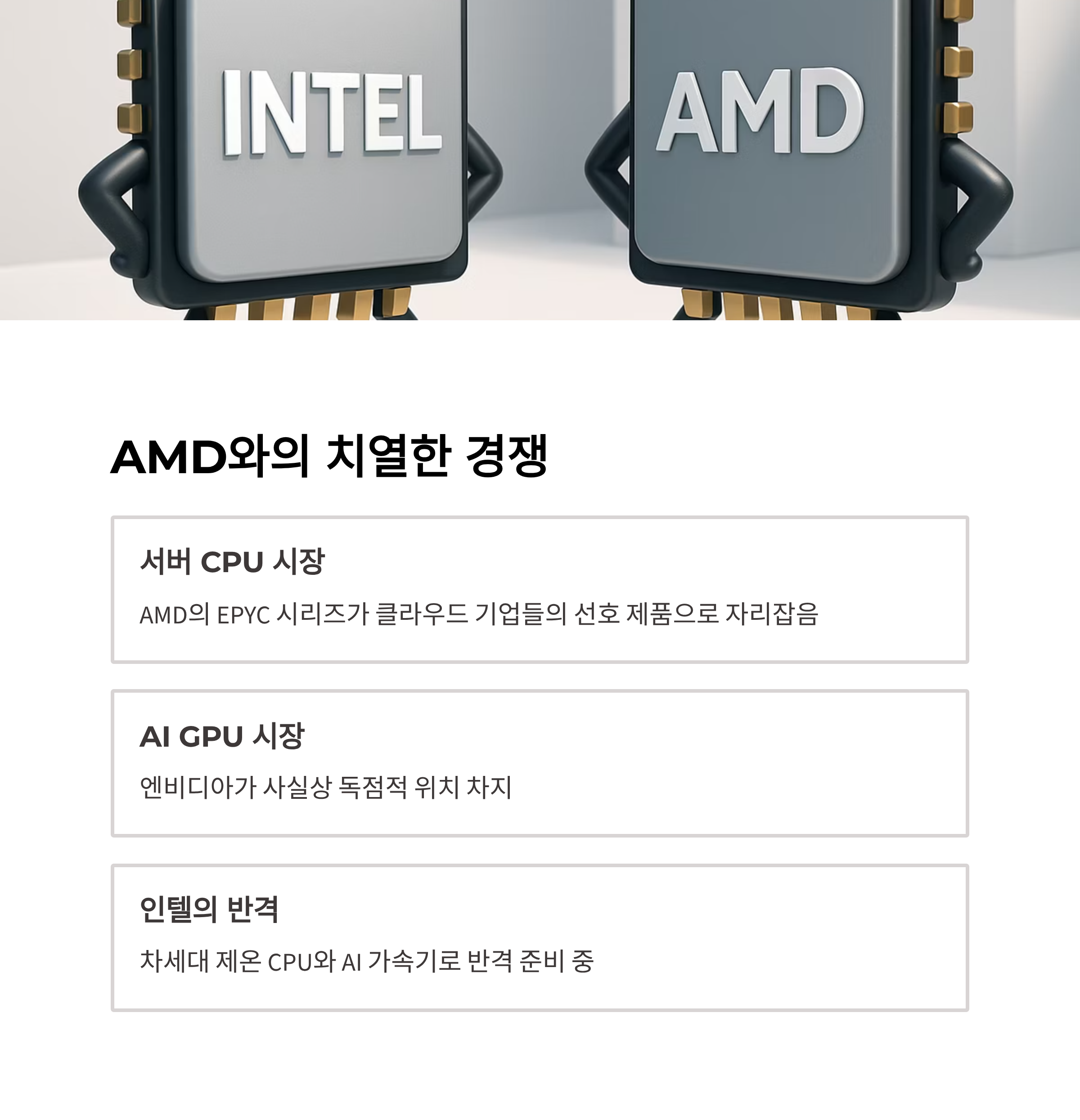 그러나 스마트폰 시대와 AI 가속기 시장이 열리면서 엔비디아, AMD 같은 경쟁사들이 급부상했습니다. 특히 데이터센터 GPU와 AI 칩 시장에서는 엔비디아가 독주했고, 서버 CPU 시장에서는 AMD가 가격 대비 성능으로 강세를 보이며 인텔의 입지를 위협하고 있습니다.