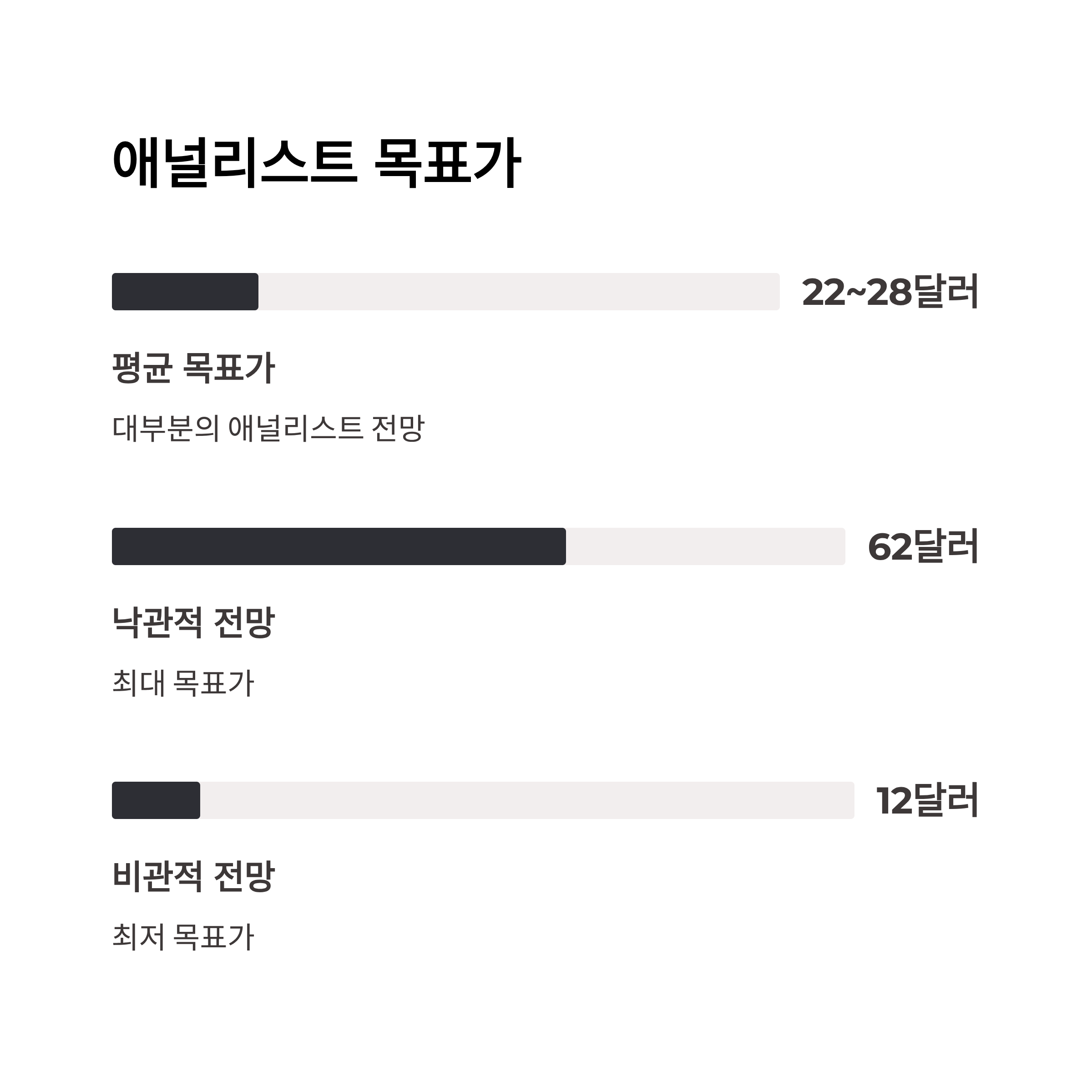 애널리스트 평균 목표가는 22~28달러이며, 낙관적 전망은 62달러, 비관적 전망은 12달러까지도 제시되고 있습니다.