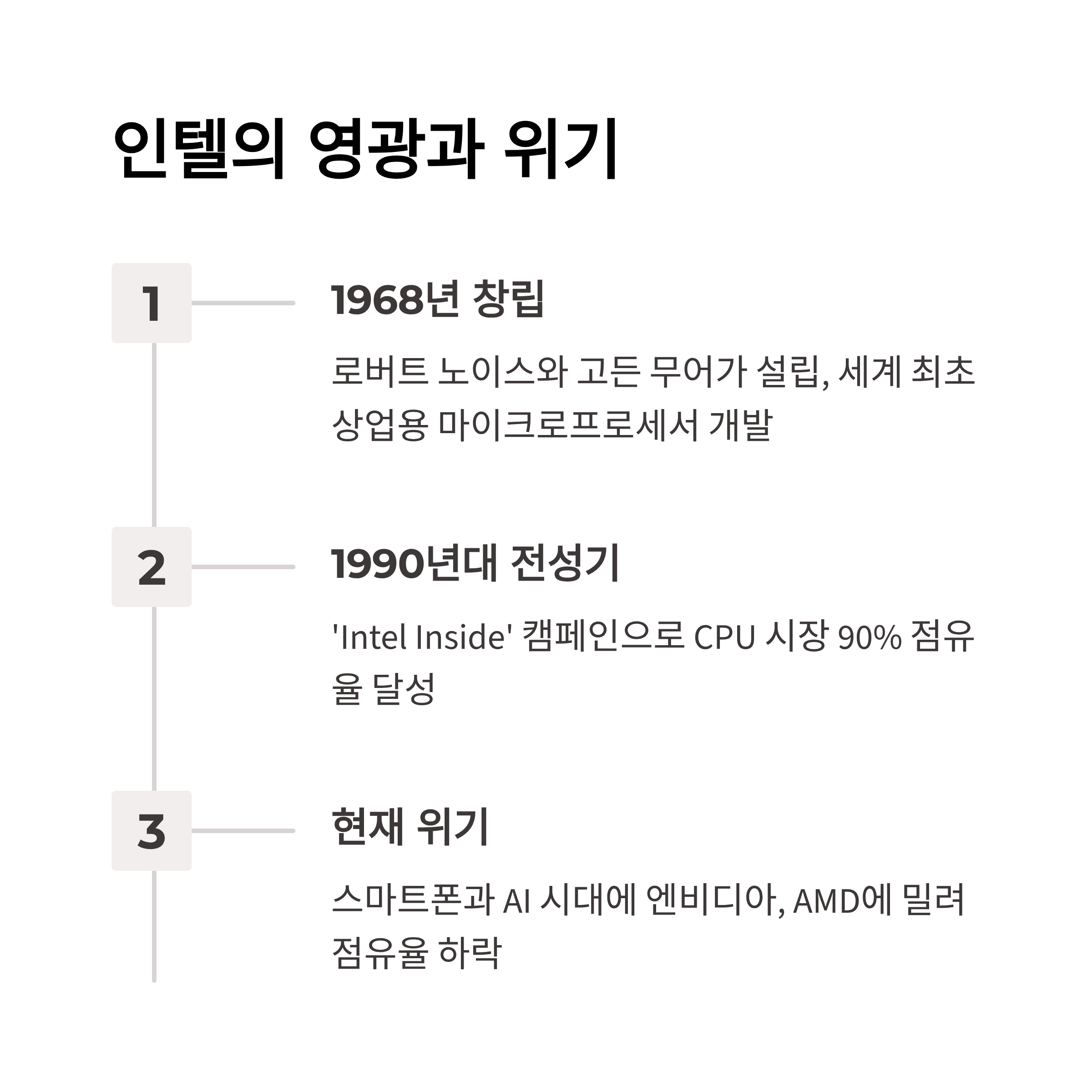 인텔은 1968년 로버트 노이스와 고든 무어가 창업한 이후, 세계 최초의 상업용 마이크로프로세서 인텔 4004를 발표하며 반도체 혁신을 주도했습니다. 1990년대에는 ‘Intel Inside’ 캠페인으로 CPU 시장의 절대 강자로 군림했으며, 한때 글로벌 PC CPU 시장 점유율이 90%에 달했습니다.