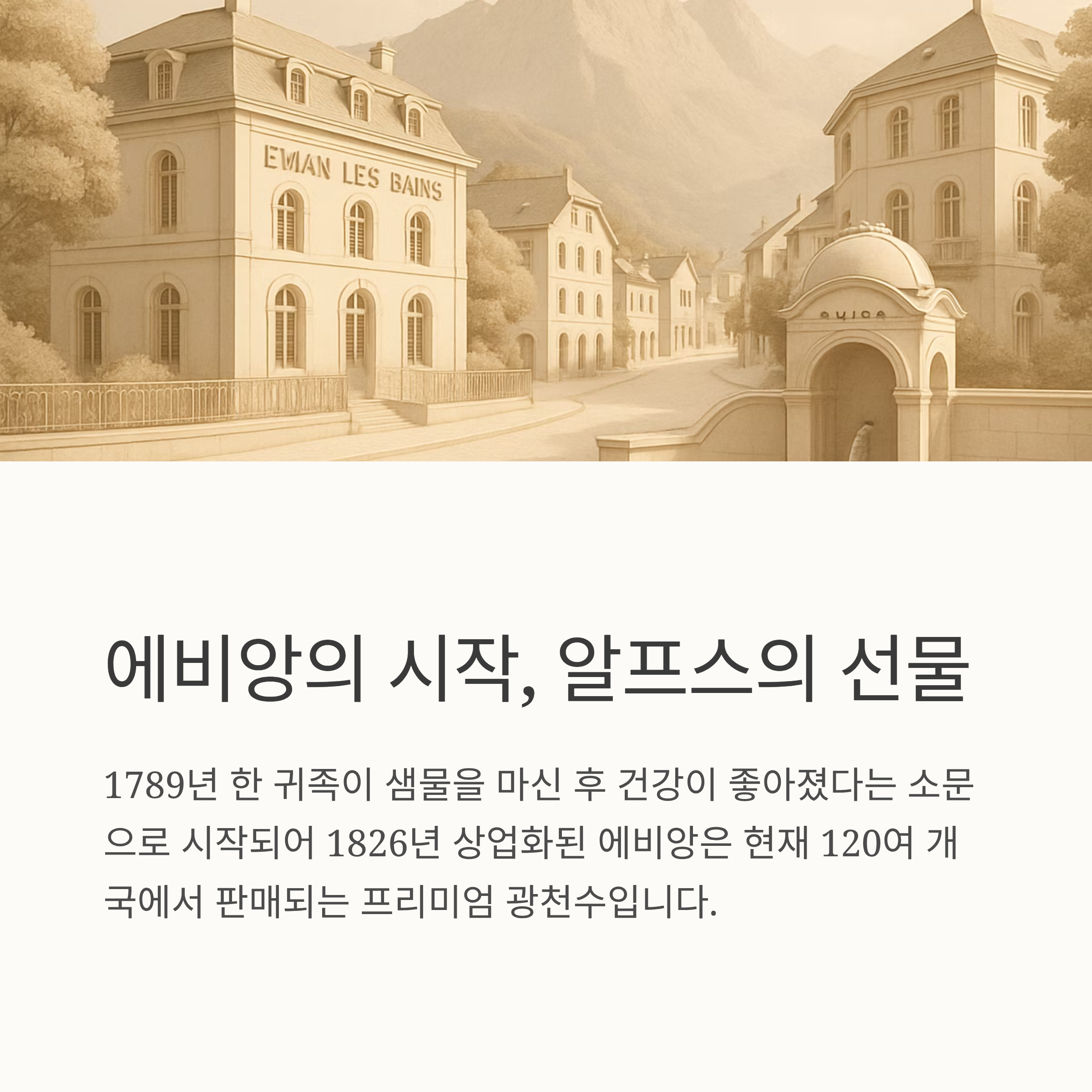 에비앙의 역사는 18세기 말로 거슬러 올라갑니다. 1789년 한 귀족이 샘물을 마신 후 건강이 좋아졌다는 소문이 퍼지면서 “치유 효과가 있는 물”로 알려졌고, 이후 1826년 상업화되어 세계적으로 퍼져나갔습니다.