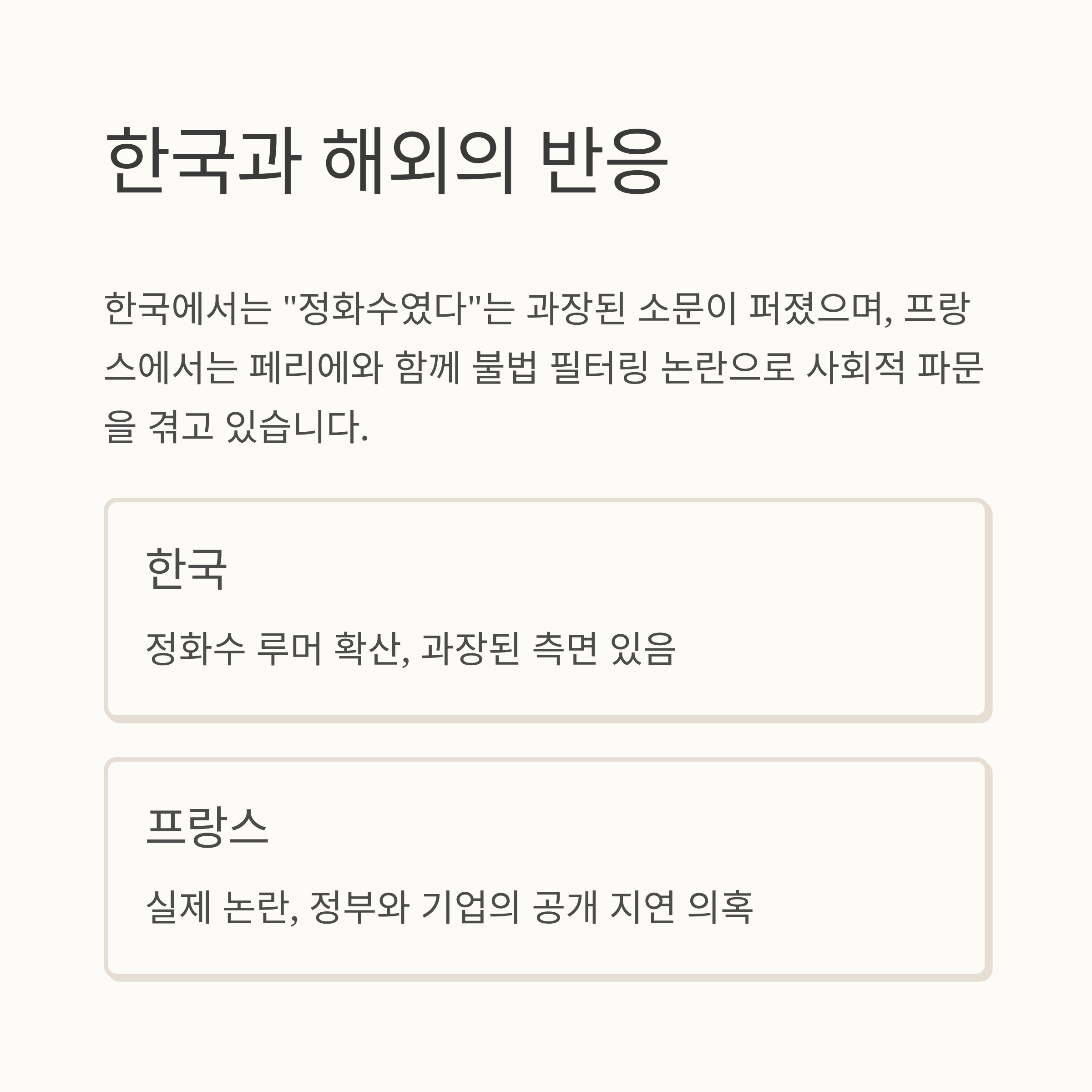 즉, 한국에서 퍼진 “정화수”라는 표현은 과장된 것이며, 정확히는 일부 정수 과정이 있었다는 점이 핵심입니다. ⚠️