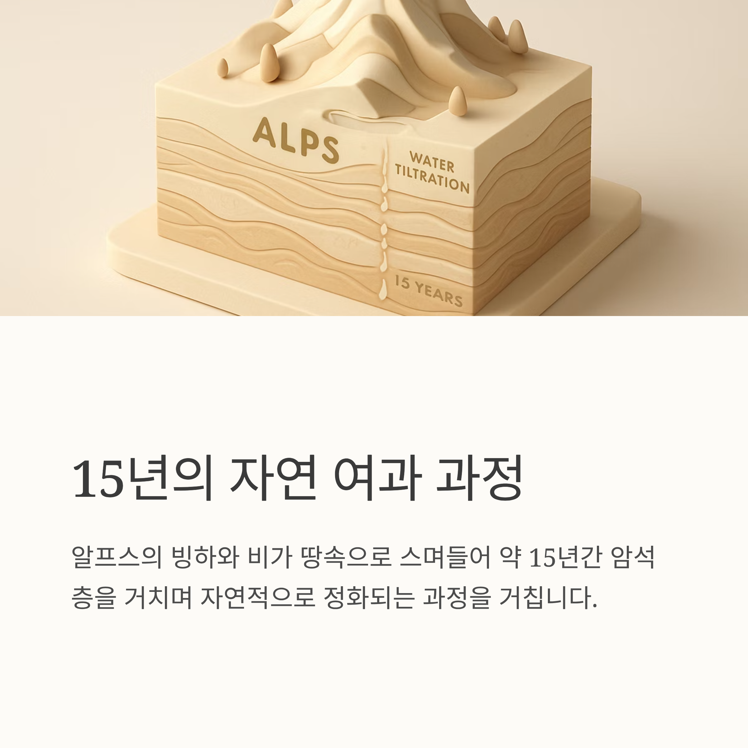 이 과정에서 칼슘, 마그네슘, 칼륨, 나트륨 등 다양한 미네랄이 자연스럽게 함유되어 pH 7.2 수준의 부드럽고 청량한 맛을 제공합니다.