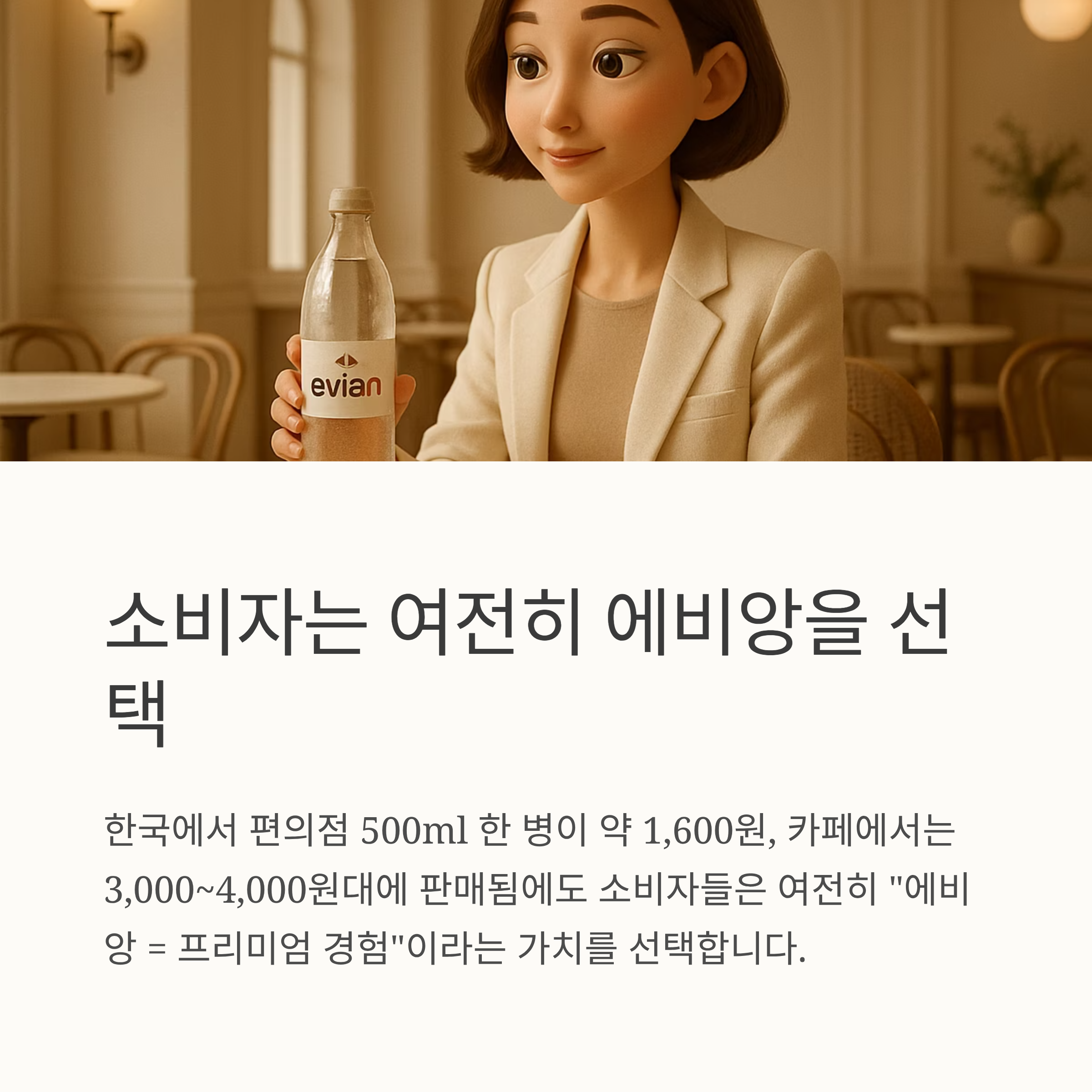 한국에서는 편의점 500ml 한 병이 약 1,600원, 카페에서는 3,000~4,000원대에 판매됩니다. 그럼에도 불구하고 소비자들은 여전히 “에비앙 = 프리미엄 경험”이라는 가치를 선택합니다.