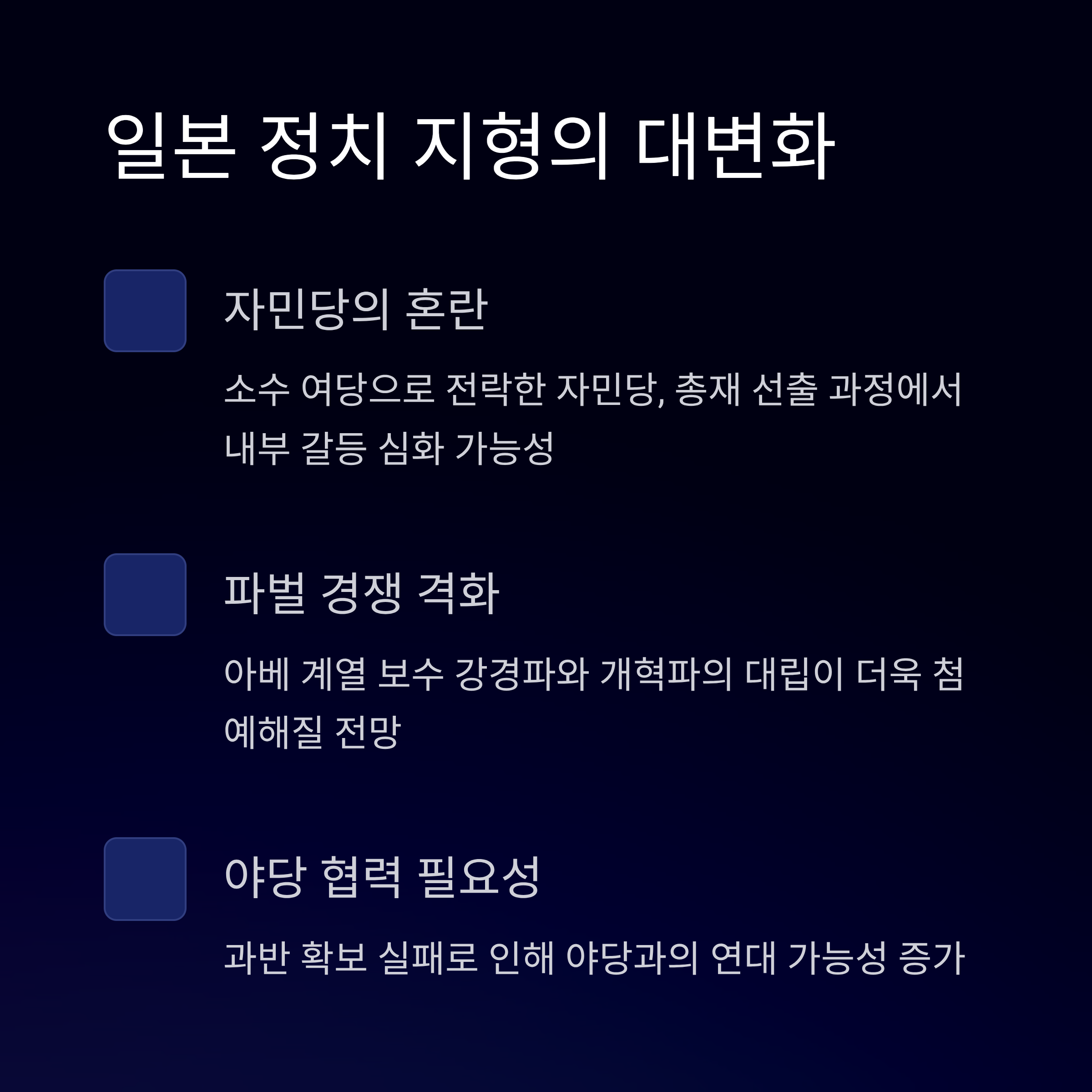 - 자민당의 혼란: 소수 여당으로 전락한 자민당은 총재 선출 과정에서 내부 갈등이 심화될 수 있습니다.