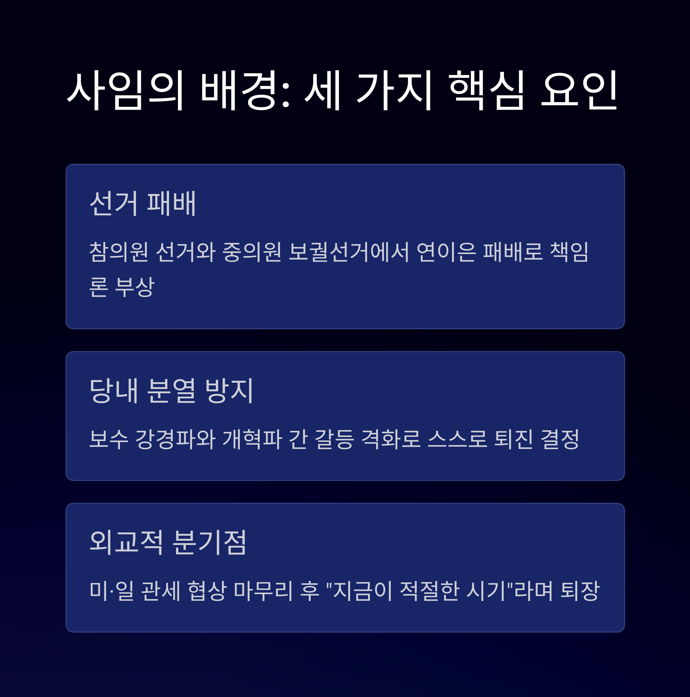 | 사임 이유 | 선거 패배 책임, 당내 분열 방지, 미·일 협상 마무리 |