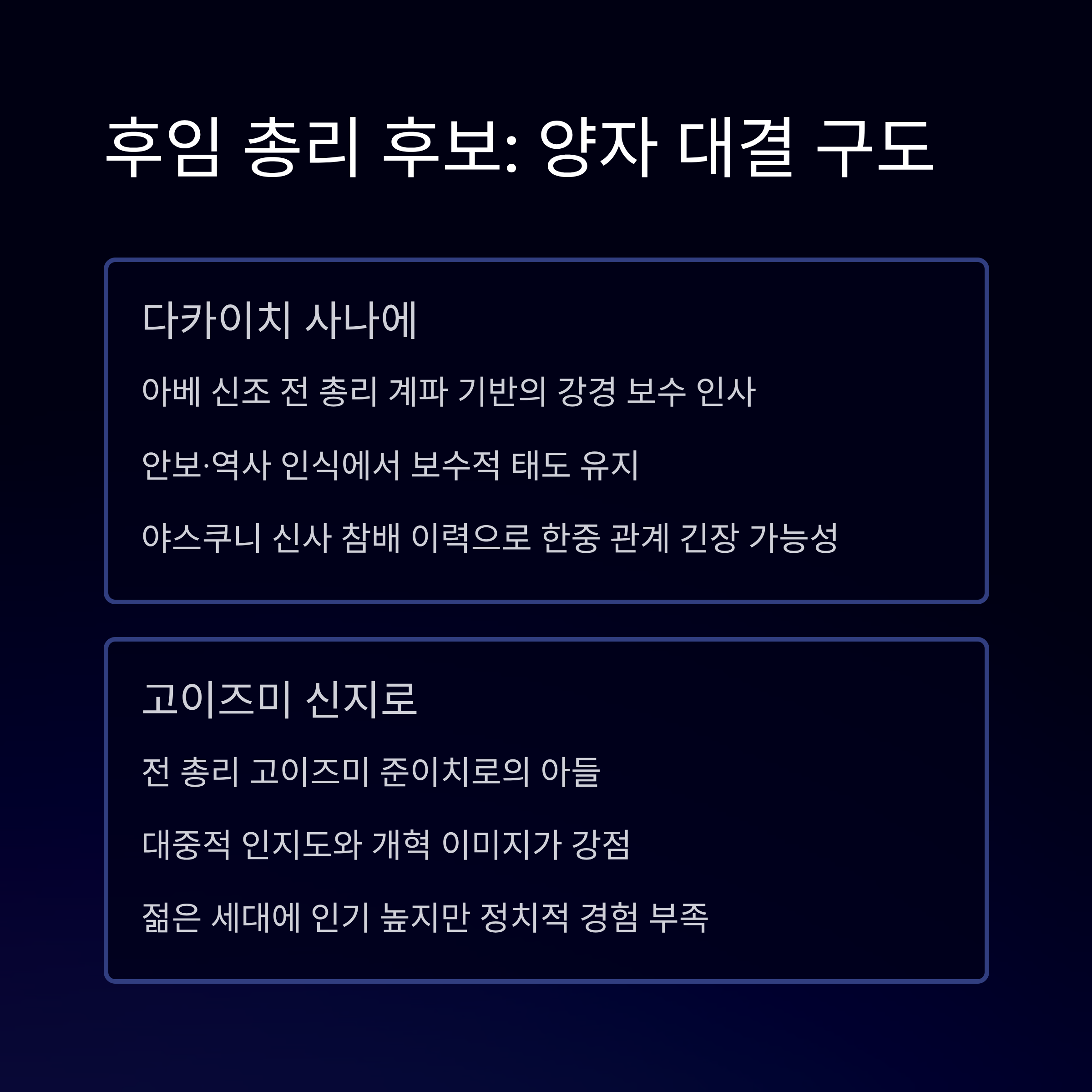 이외에도 하야시 요시마사 관방장관, 고바야시 다카유키 전 경제안보상 등이 후보군에 포함되지만, 현실적으로는 다카이치와 고이즈미 간 양자 대결이 유력합니다.