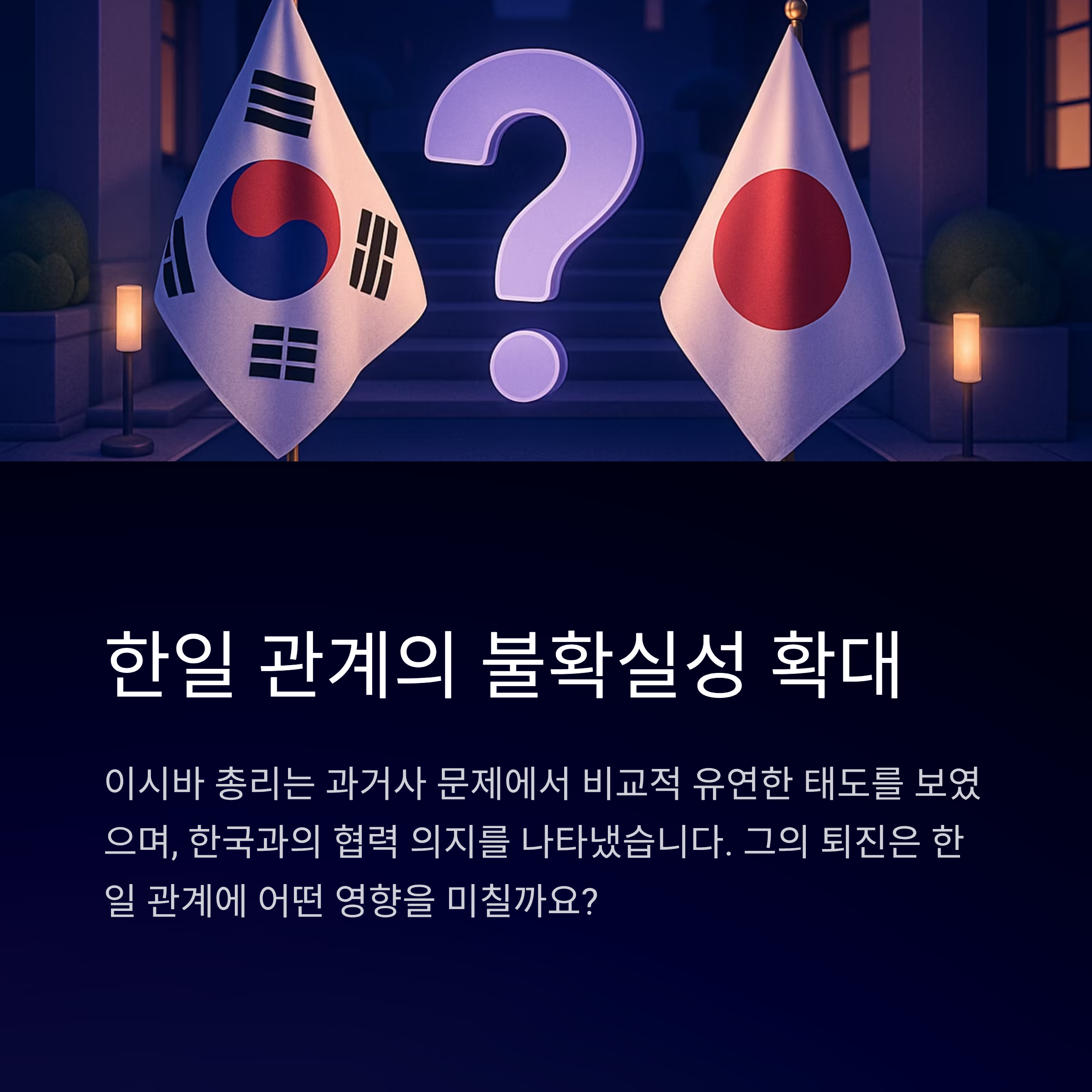 한국 입장에서는 이번 사임이 외교적으로도 중요한 변수입니다. 이시바 총리는 비교적 유연한 태도를 보여왔으나, 후임 후보들의 성향은 강경 보수에 가깝습니다.