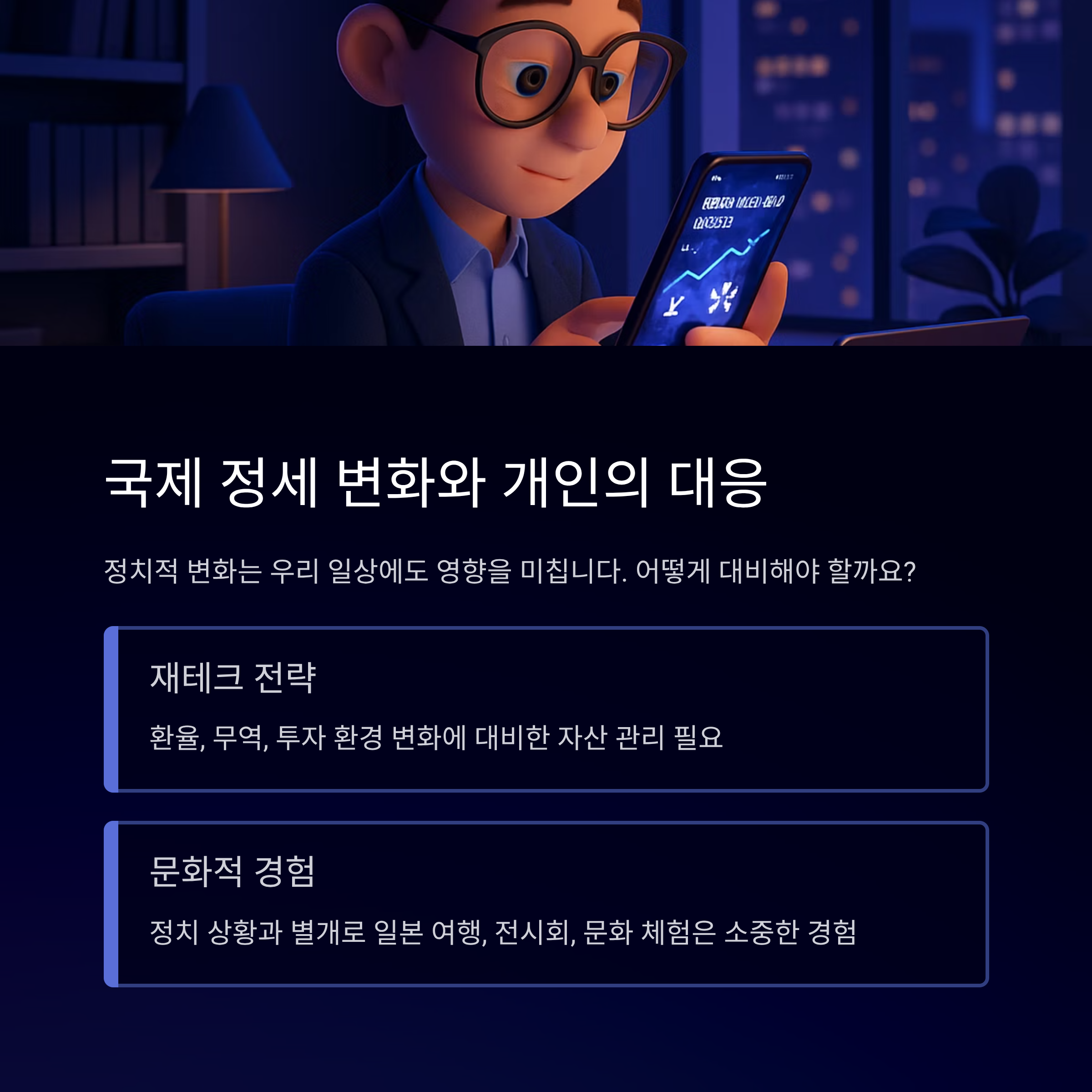 국제 정치의 변화는 개인의 삶에도 영향을 미칩니다. 환율, 무역, 투자 환경 변화에 대비하기 위해 재테크와 신용 관리의 필요성이 커지고 있습니다.