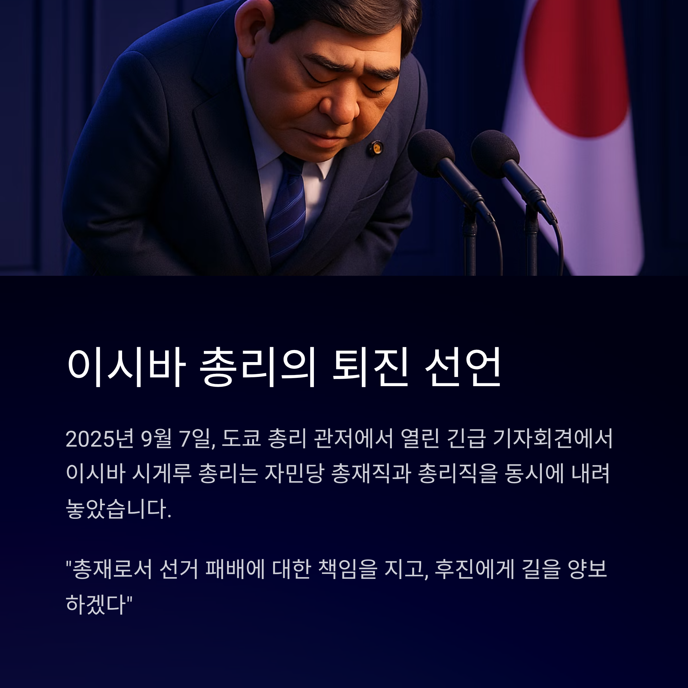 2025년 9월 7일, 일본 도쿄 총리 관저에서 열린 긴급 기자회견에서 이시바 시게루 총리가 사임을 선언했습니다. 그는 자민당 총재직과 총리직을 동시에 내려놓으며 “총재로서 선거 패배에 대한 책임을 지고, 후진에게 길을 양보하겠다”는 입장을 밝혔습니다.