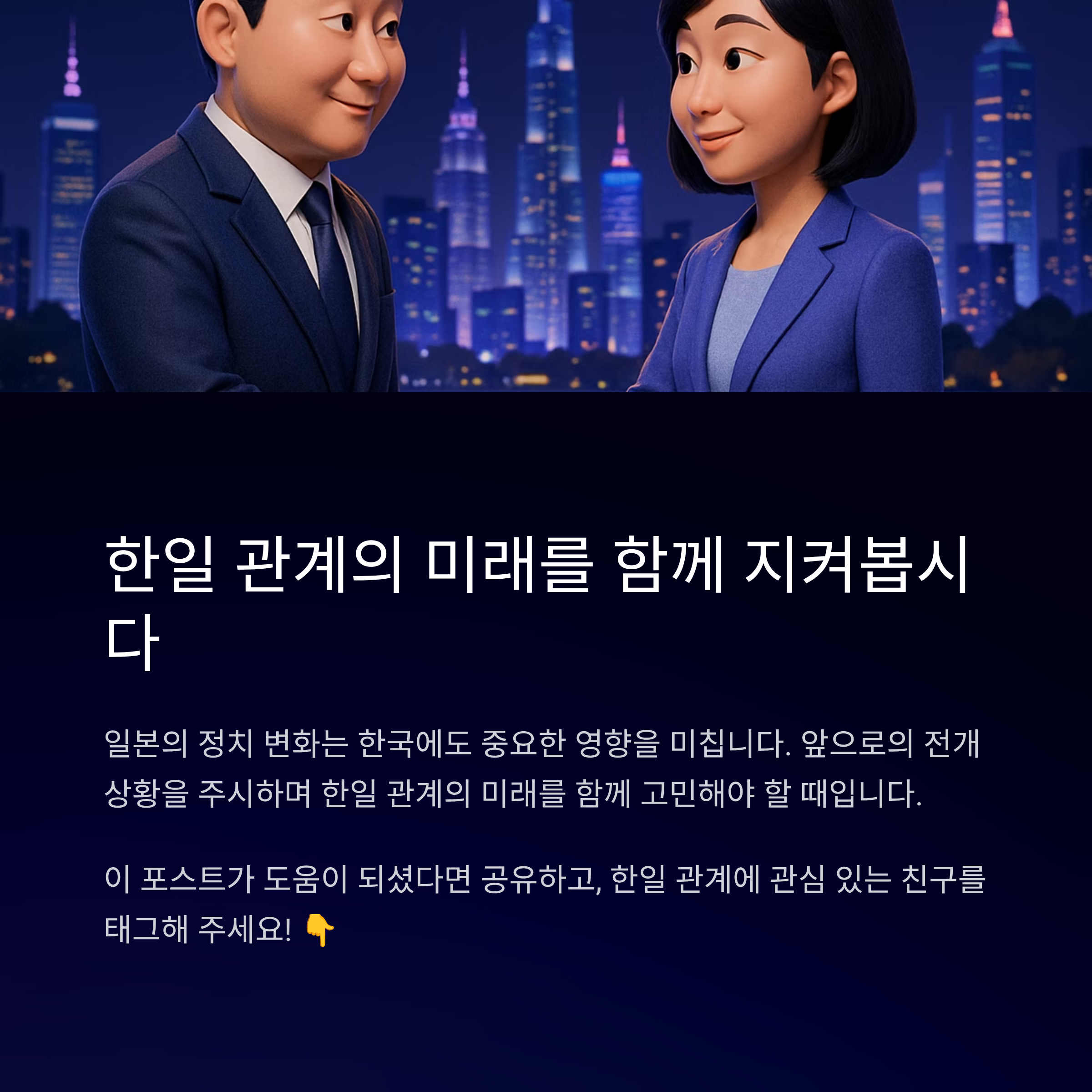 이시바 총리의 사임은 일본 정치사에서 중요한 전환점입니다. 후임 총리 후보의 성향에 따라 일본 정치뿐 아니라 한일 관계의 방향성도 크게 달라질 수 있습니다. 자민당 총재 선거와 국회 총리 지명 절차를 면밀히 지켜볼 필요가 있습니다.