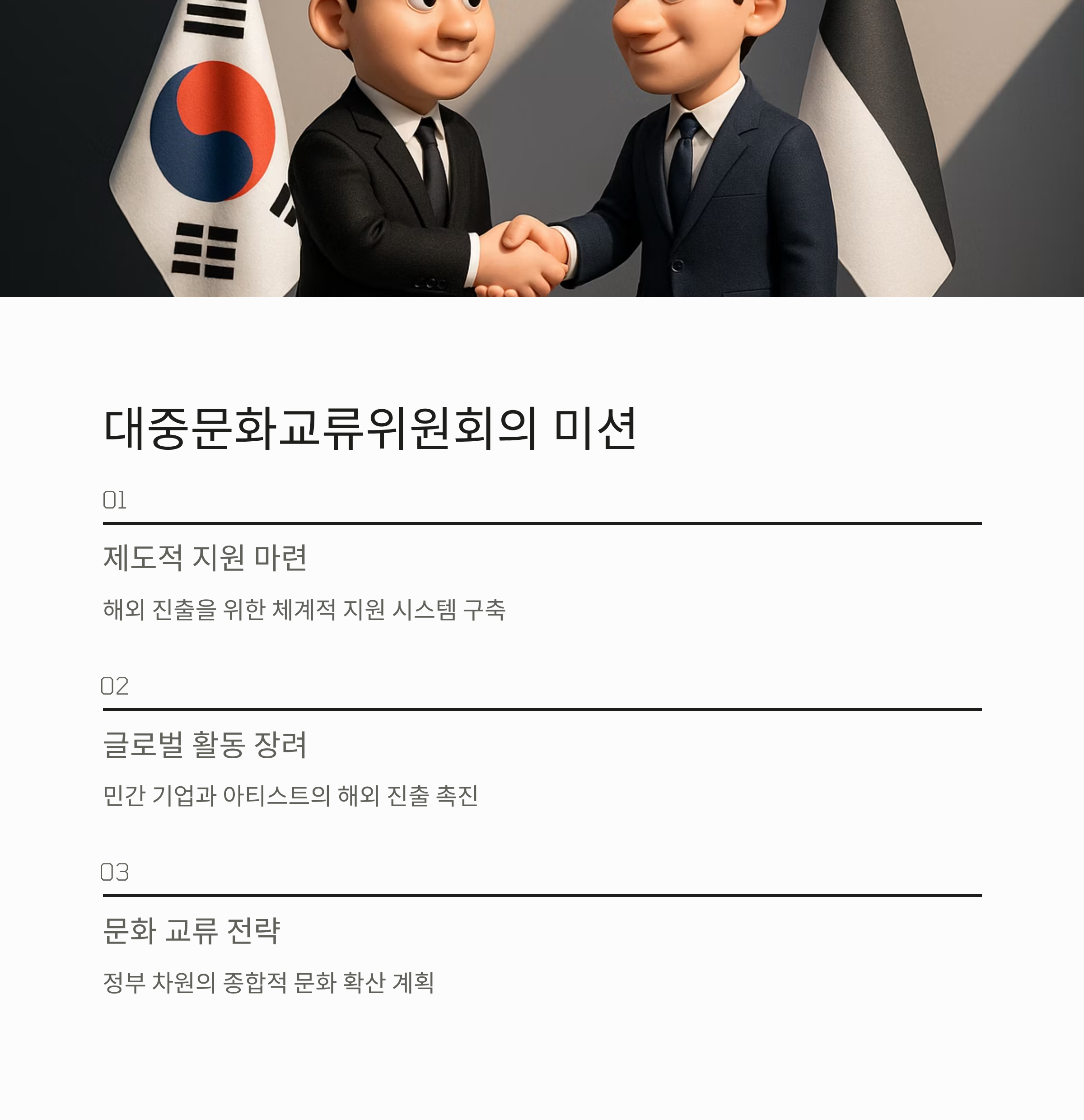 대중문화교류위원회는 대통령 직속으로 신설된 조직으로, 한국 대중문화의 해외 확산을 지원하는 데 목표를 두고 있습니다.