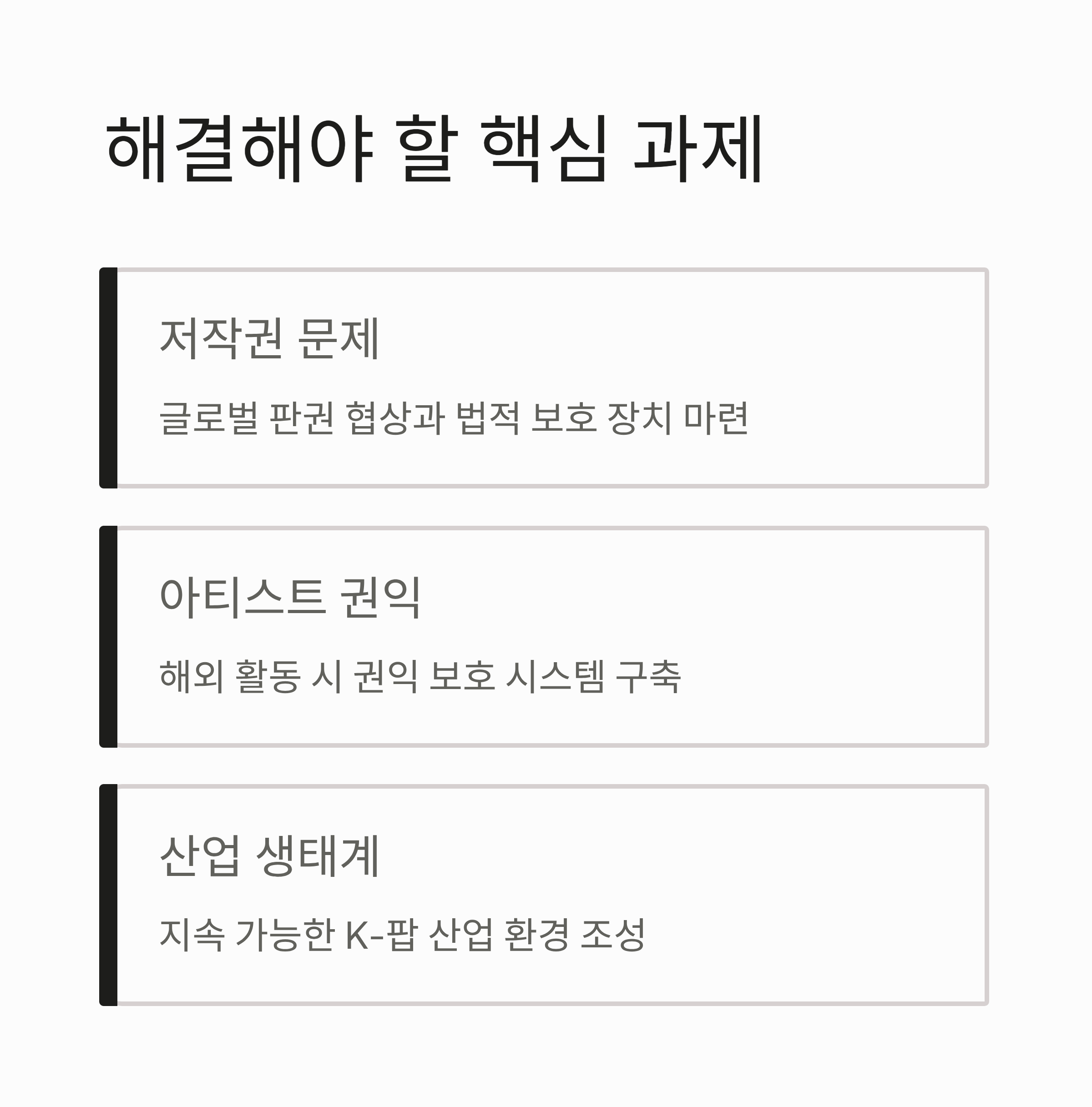 K-팝은 이미 BTS, 블랙핑크, 스트레이 키즈 등 세계적인 아티스트의 등장을 통해 글로벌 브랜드로 자리 잡았습니다. 그러나 법적·제도적 지원은 아직 부족합니다.