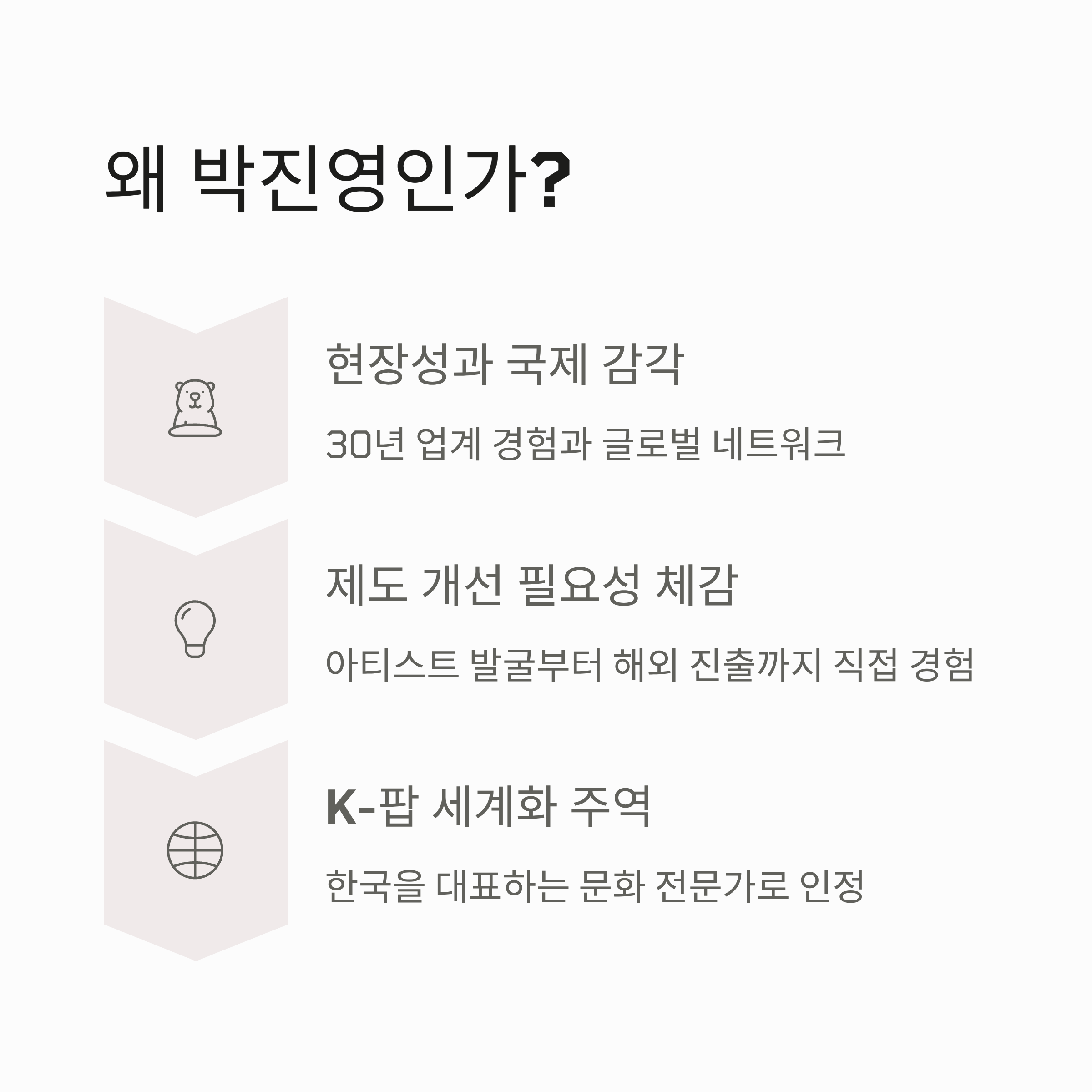 박진영의 대중문화교류위원회 공동위원장 내정은 K-팝과 한국 대중문화의 미래를 위한 중요한 전환점입니다. 현장에서의 경험과 글로벌 네트워크를 정책으로 연결해 K-팝 세계화를 제도적으로 지원하는 역할을 맡게 된 것입니다.