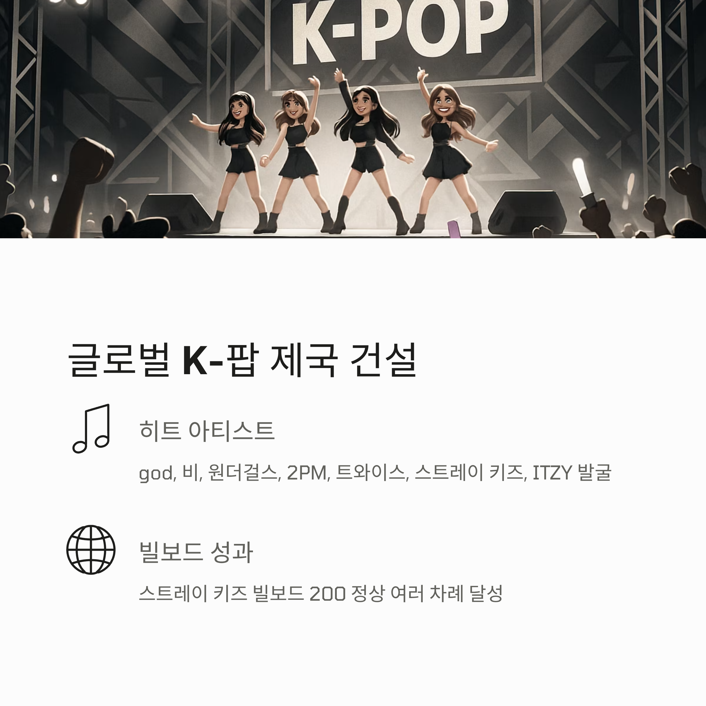- 글로벌 도전: 원더걸스를 빌보드 차트에 진입시키고, 스트레이 키즈를 빌보드 200 정상에 여러 차례 올려놓으며 K-팝을 세계적인 브랜드로 성장시켰습니다.