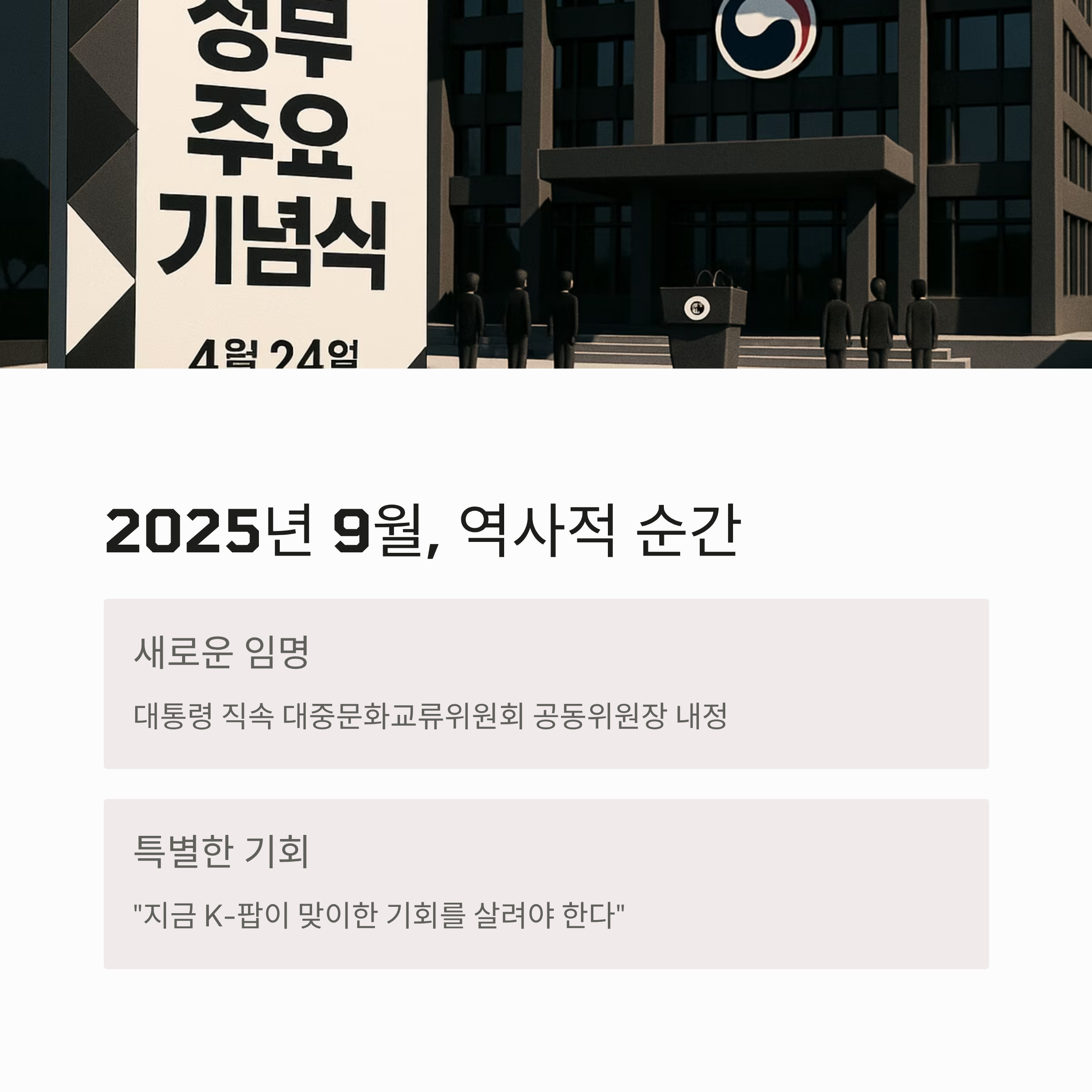 2025년 9월, JYP엔터테인먼트의 수장 박진영이 대통령 직속 기구인 대중문화교류위원회 공동위원장으로 내정되었습니다. 그는 가수와 프로듀서로서 한국 대중문화를 세계 무대에 올려놓은 주역이자, 이제는 정책 영역에서 K-팝 세계화를 지원할 핵심 인물로 주목받고 있습니다.