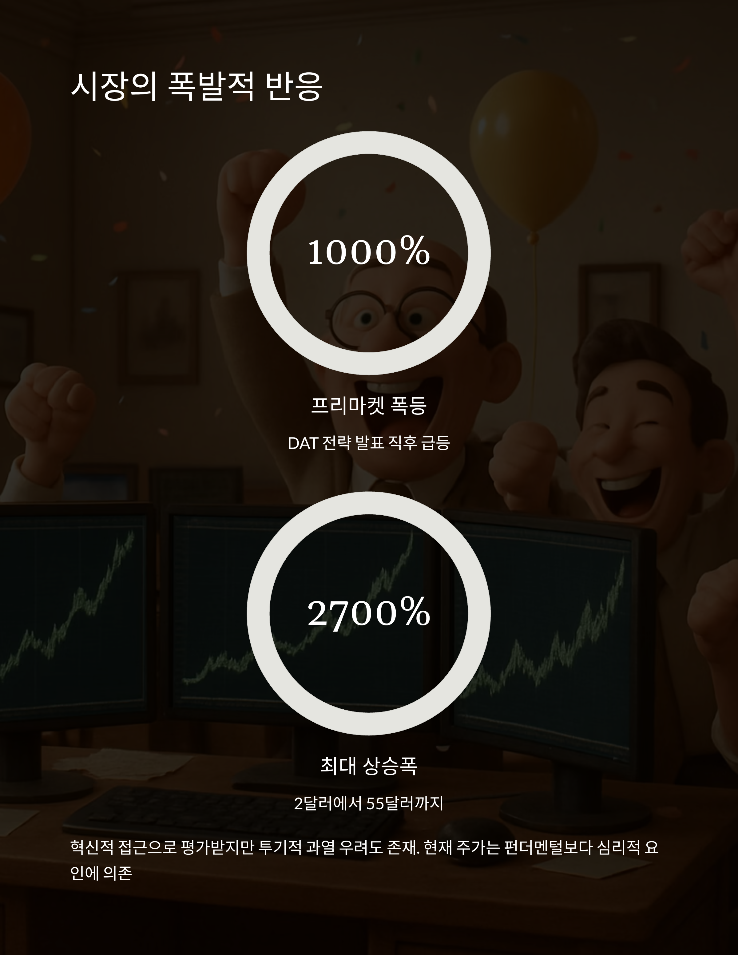 하루 만에 수십 배 변동폭을 기록하며 극단적 변동성을 보이고 있습니다. DAT 전략 발표 이후 프리마켓에서 1,000% 이상 폭등했던 사례는 투자자 심리를 잘 보여줍니다.
