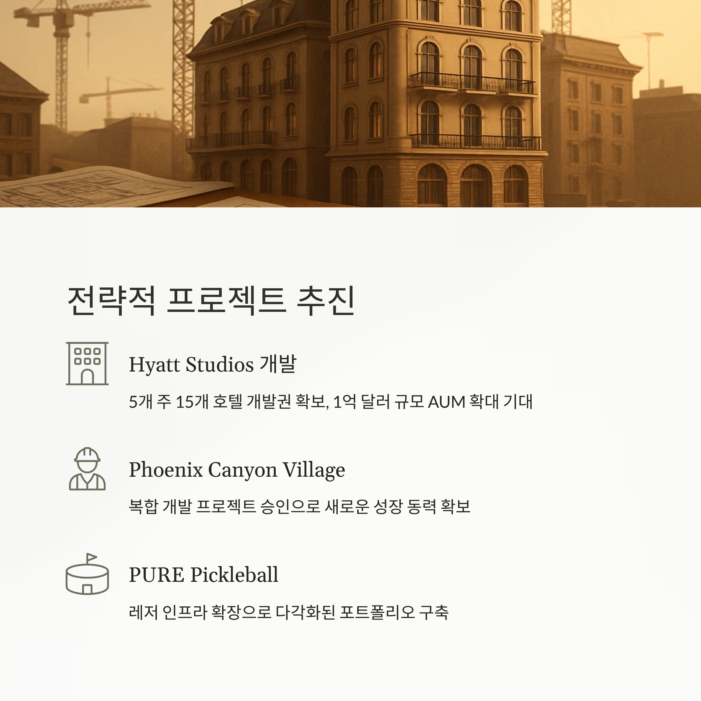 Phoenix Canyon Village 복합 개발과 PURE Pickleball 레저 인프라 구축 등은 향후 장기 성장 기반이 될 전망입니다.