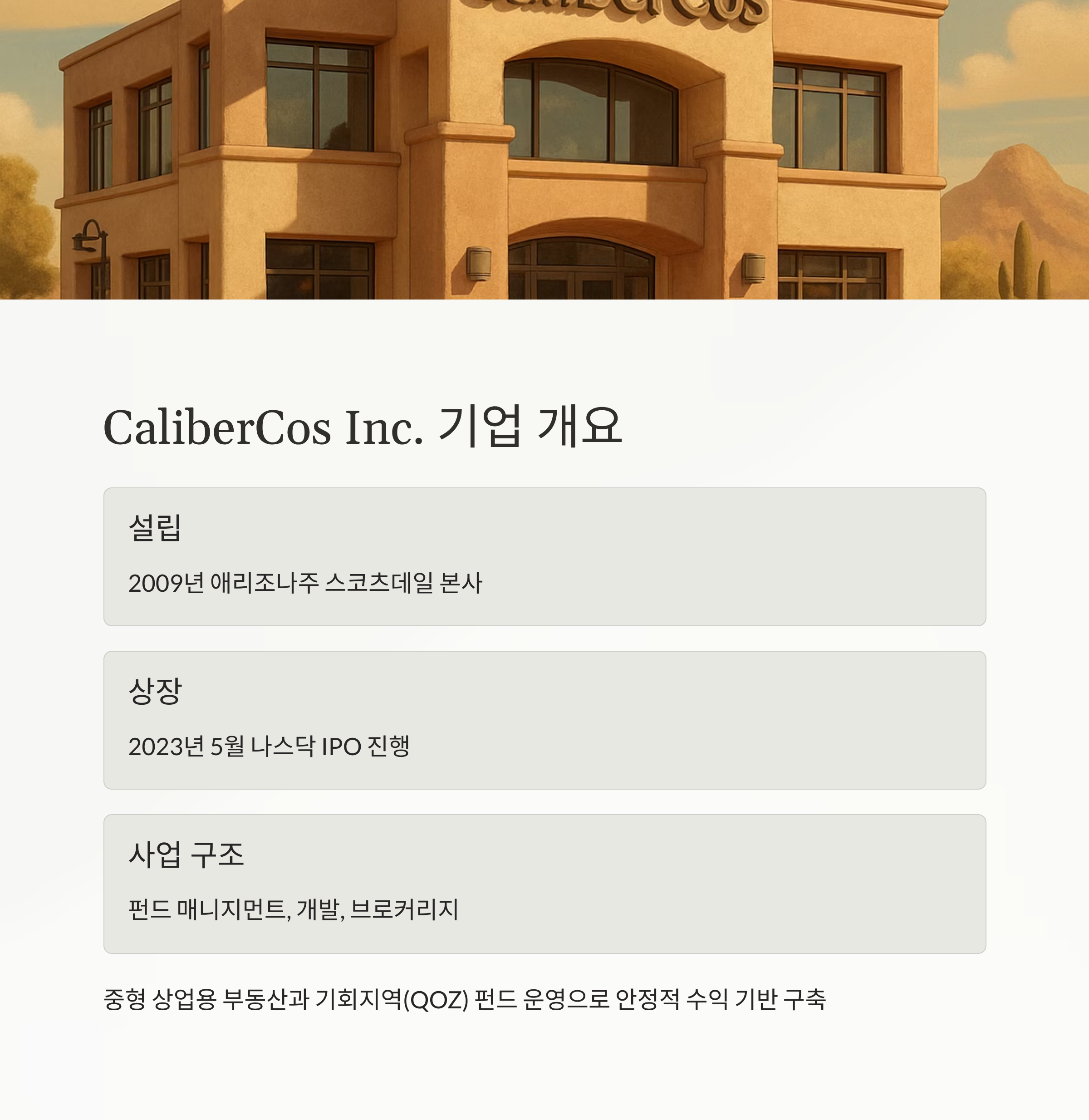 CaliberCos Inc.는 미국 애리조나주 스코츠데일에 본사를 둔 부동산 투자 및 자산 관리 기업입니다. 2009년에 설립되어 2023년 5월 나스닥에 상장했으며, 현재 사업 구조는 펀드 매니지먼트, 개발, 브로커리지 세 가지로 구성됩니다.