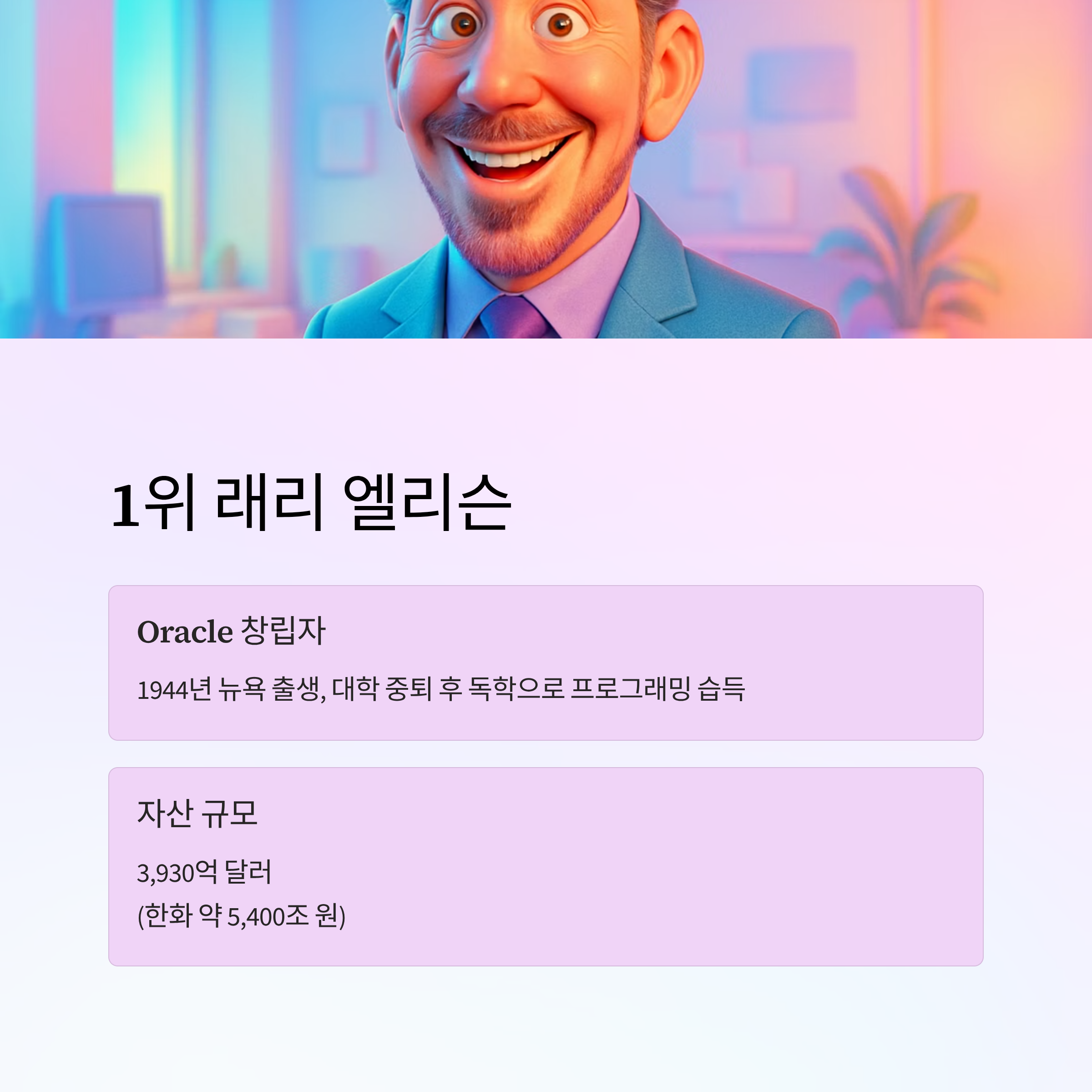 | 1 | Larry Ellison | Oracle | 3,930억 달러 (5,400조 원) |