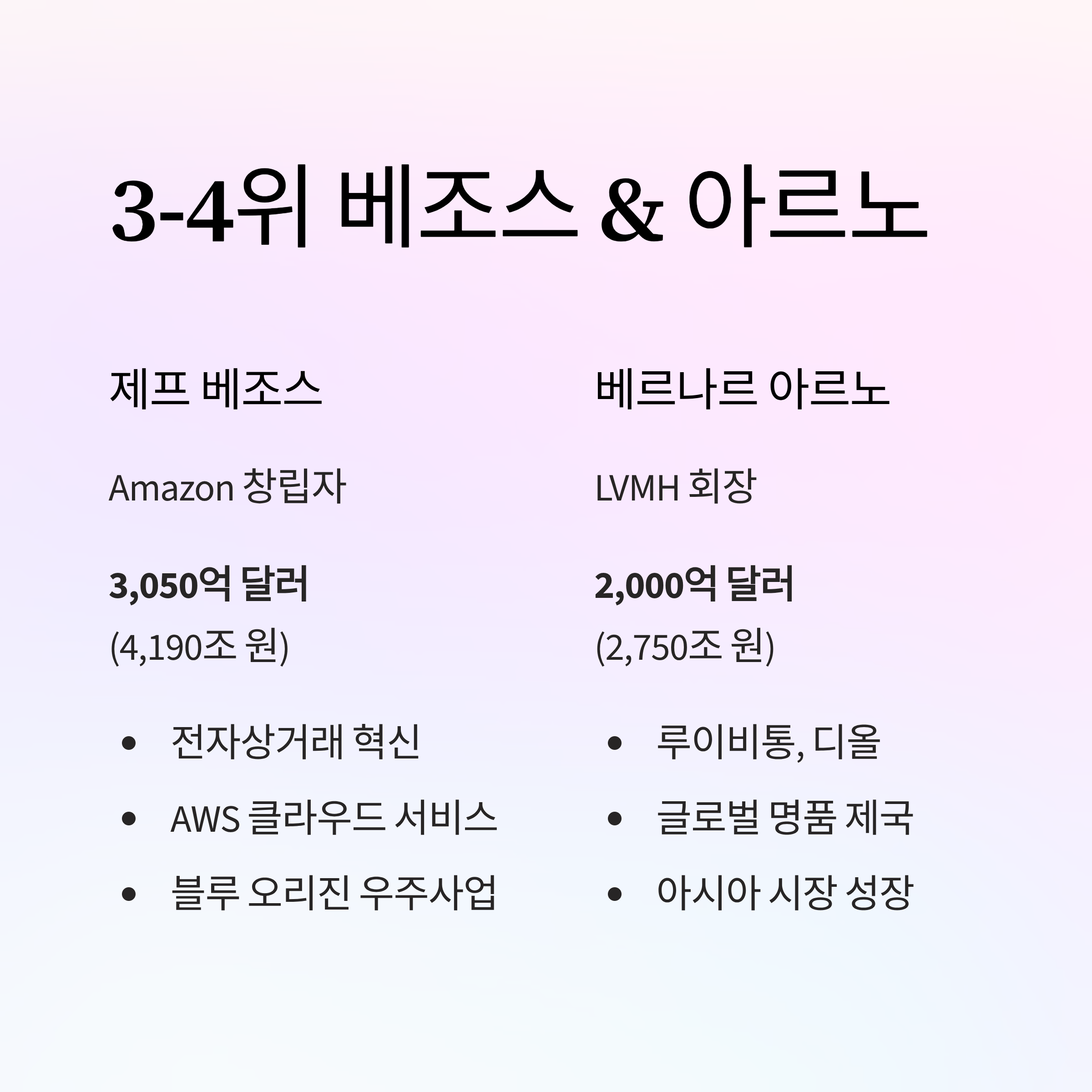 | 4 | Bernard Arnault | LVMH | 2,000억 달러 (2,750조 원) |