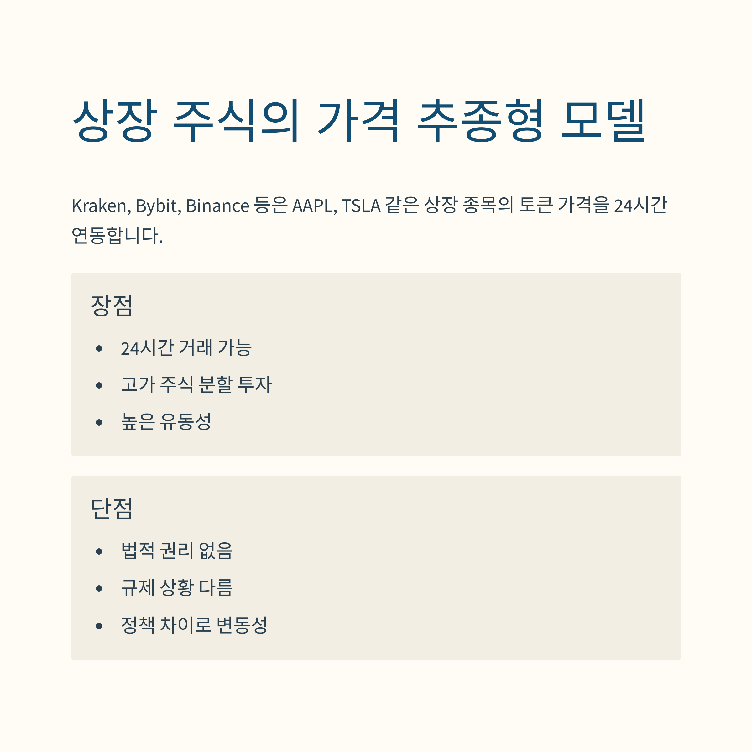 Kraken, Bybit, Binance 등은 AAPL, TSLA 등 상장 종목의 토큰 가격을 24시간 연동합니다.