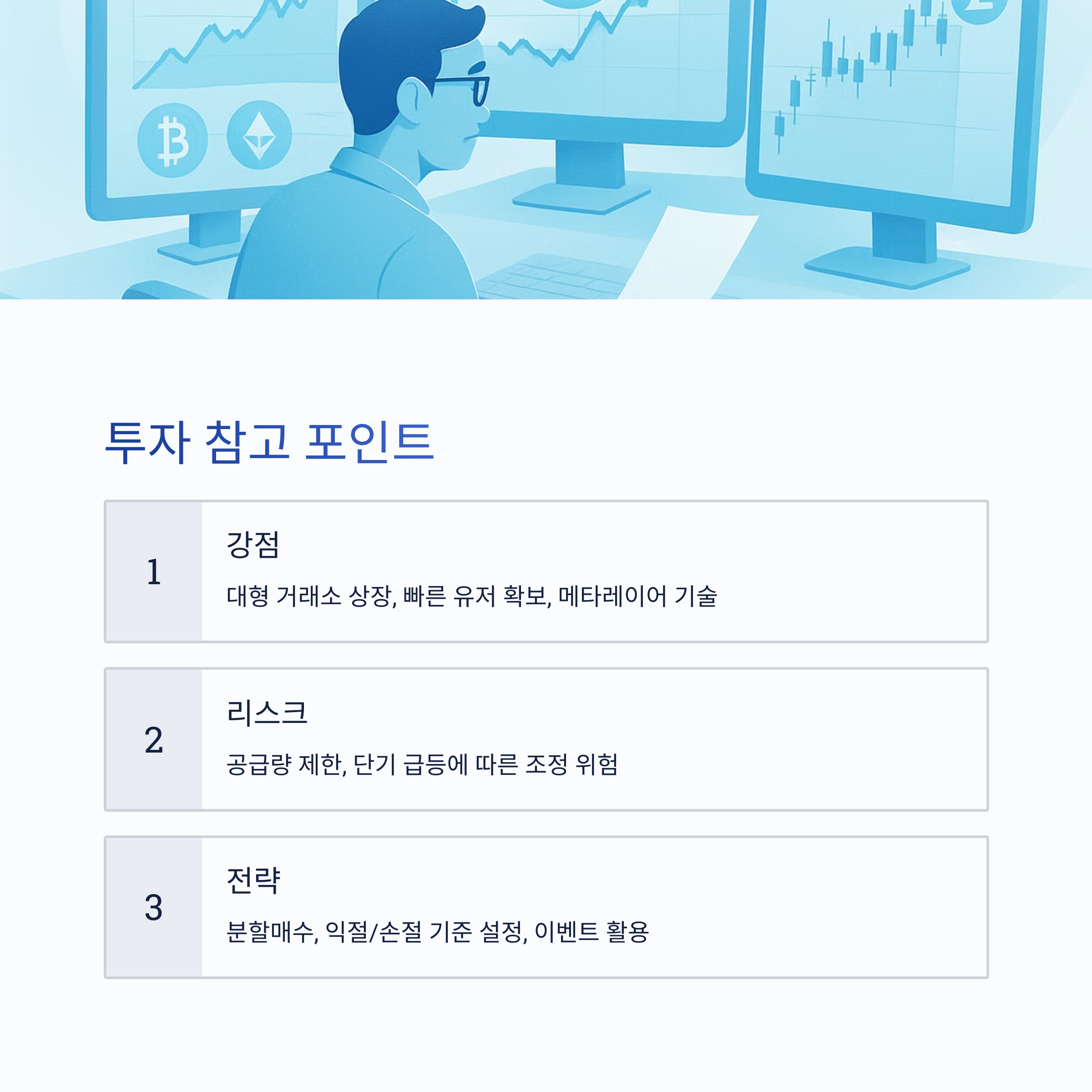 | 강점 | 대형 거래소 상장, 빠른 유저 확보, 메타레이어 기술 |